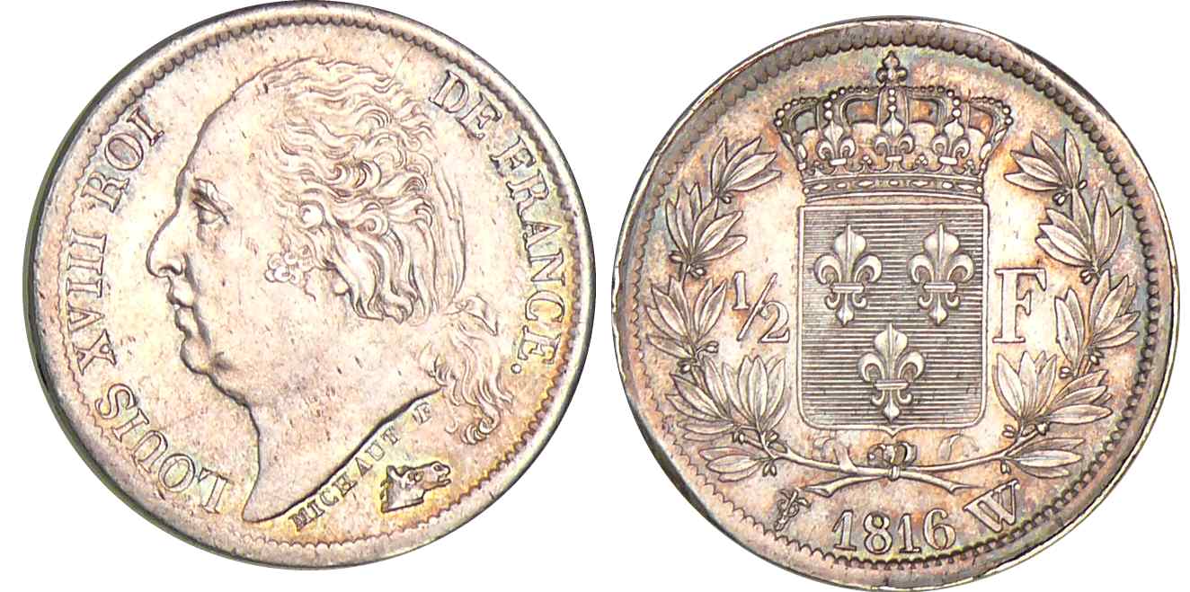1/2 franc Louis XVIII au buste nu – 1816 W (Lille)