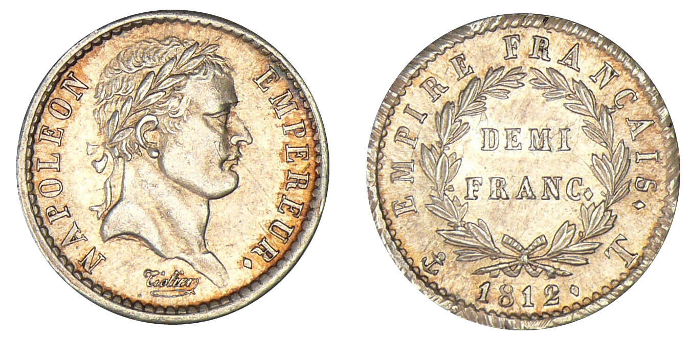 1/2 franc Napoléon revers Empire 1812 T (Nantes)