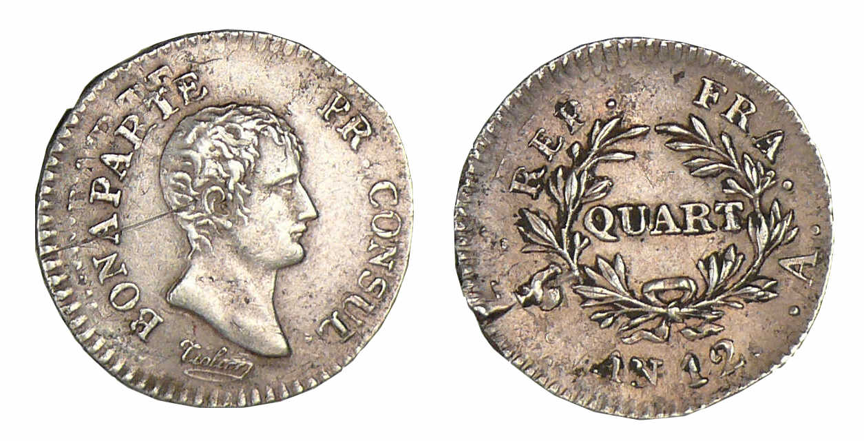 Revers : R/ REP. FRA. (millésime) (atelier) QUART, dans une couronne de deux branches d’olivier.