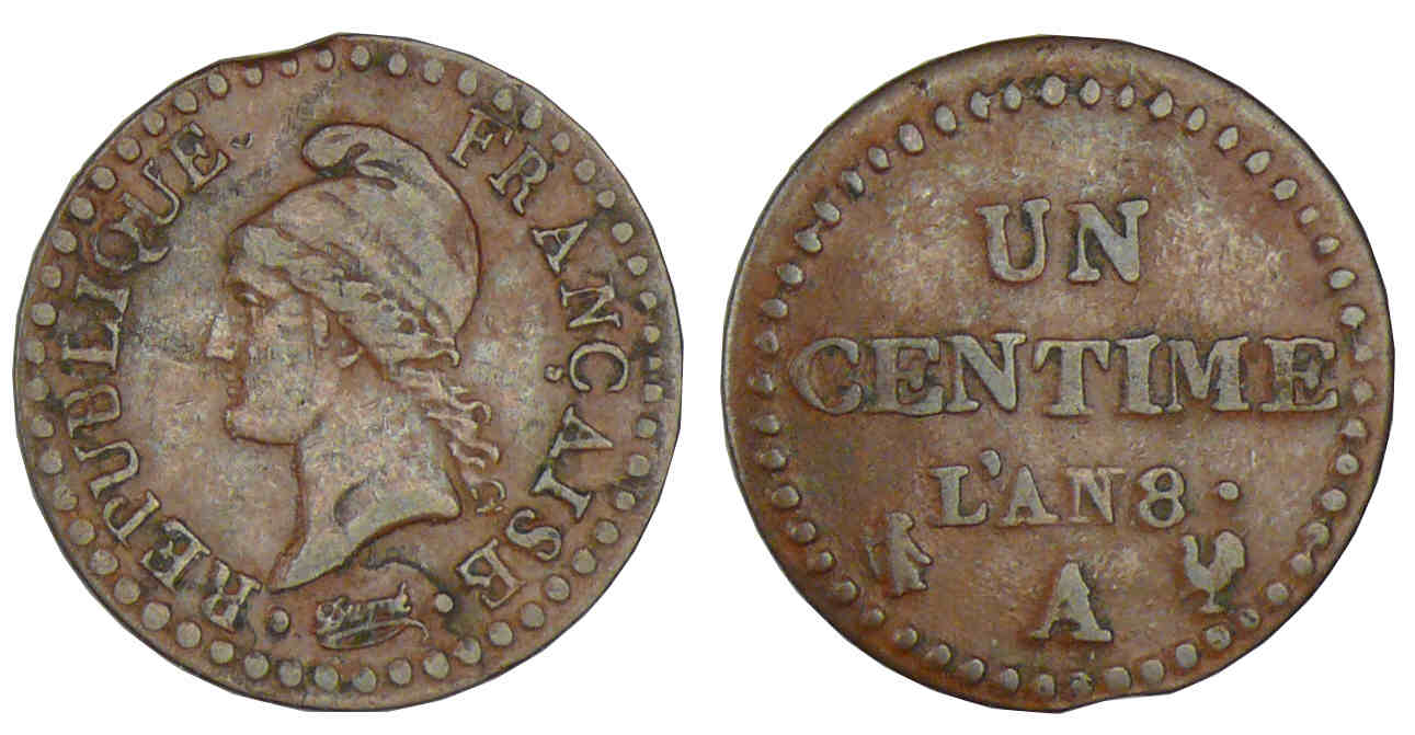 Revers : R/ 1 / CENTIME. / L’AN 8. / A. en quatre lignes.
