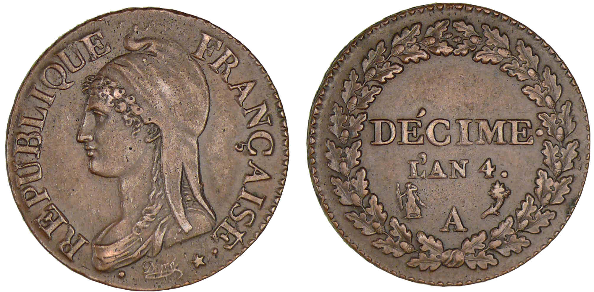 Revers : R/ DECIME L’AN 4 (atelier) dans une couronne de chêne.