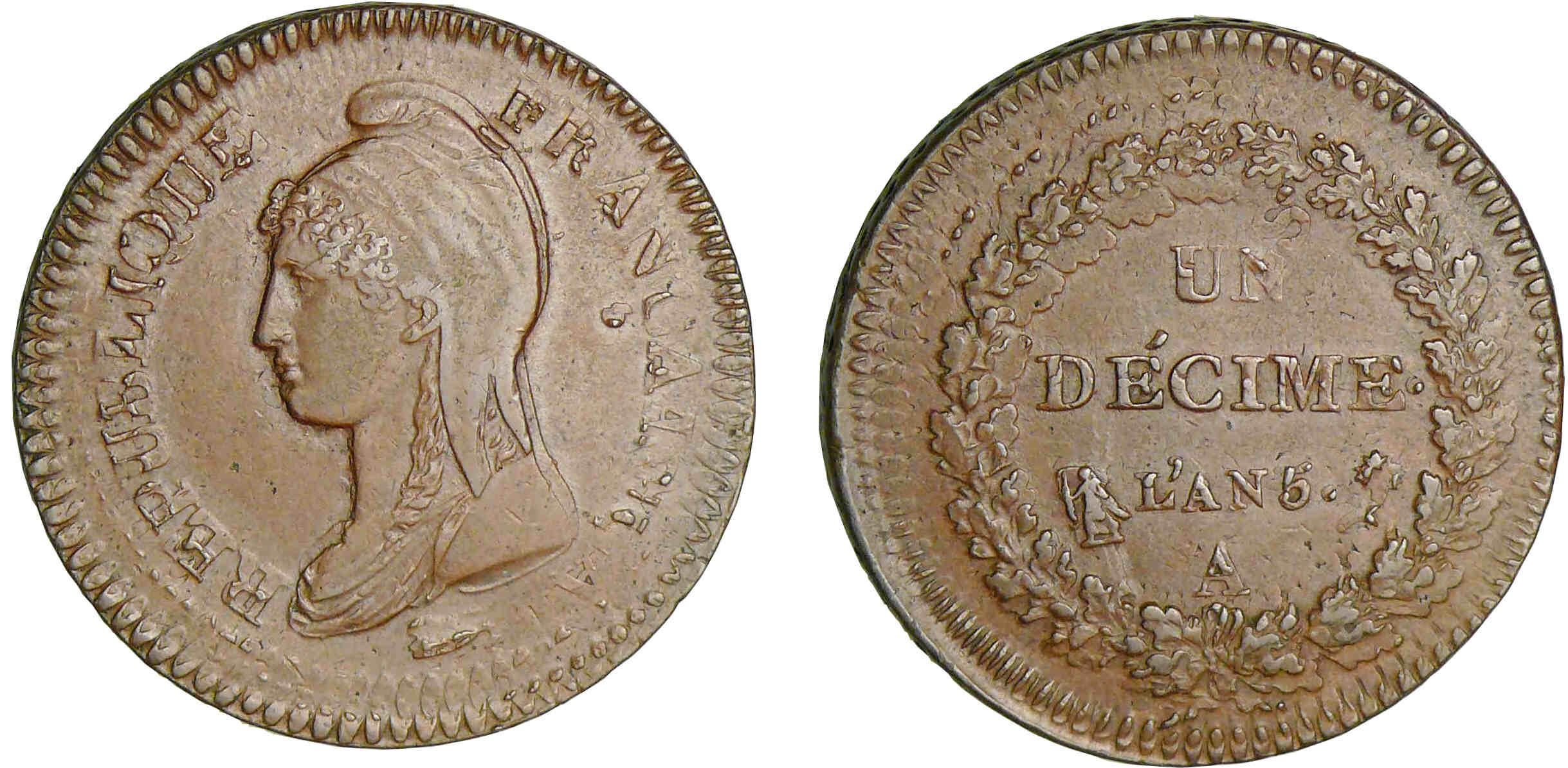 1 décime Dupré – surfrappe du 2 décimes – An 5 A (Paris)