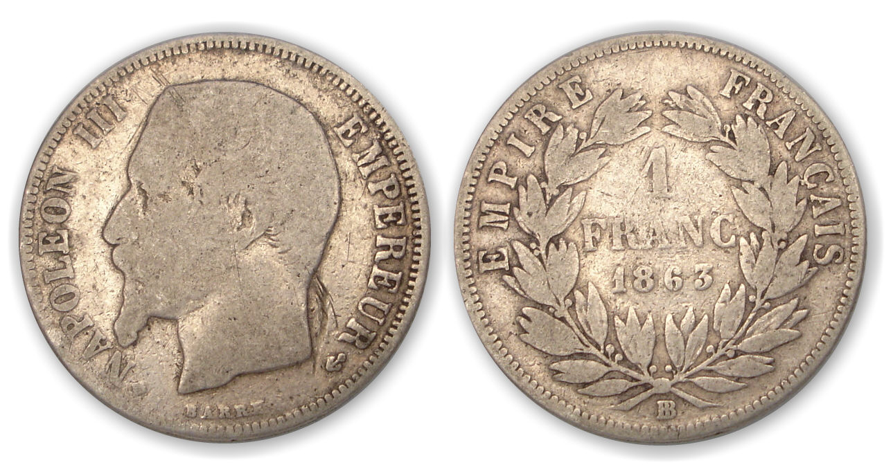 Revers : R/ EMPIRE FRANCAIS / 1 FRANC (atelier) (millésime) (mg) dans une couronne de laurier et d’olivier.