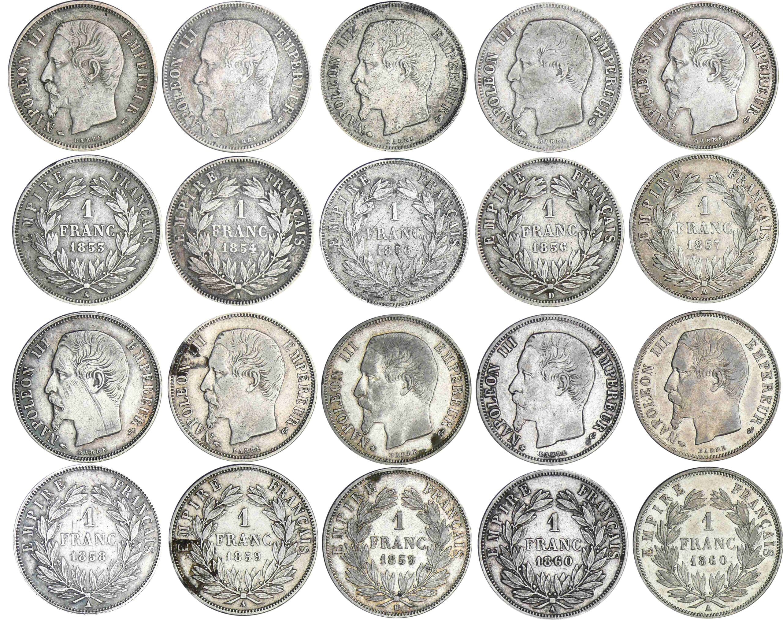 1 franc Napoléon III tête nue – Lot de 10 monnaies