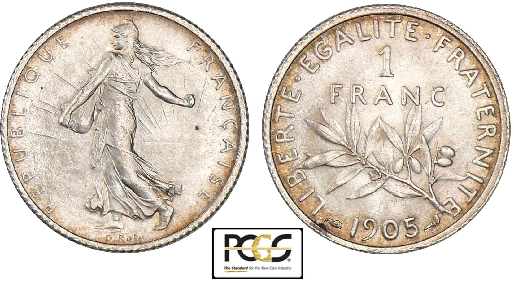 Revers : R/.LIBERTE. EGALITE. FRATERNITE. 1 / FRANC au-dessus d’une branche d’olivier. Millésime à l’exergue.