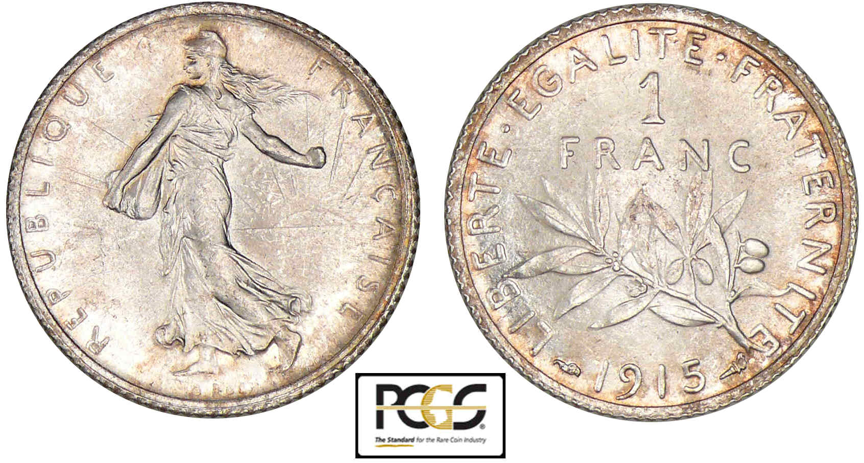 Revers : R/.LIBERTE. EGALITE. FRATERNITE. 1 / FRANC au-dessus d’une branche d’olivier. Millésime à l’exergue.
