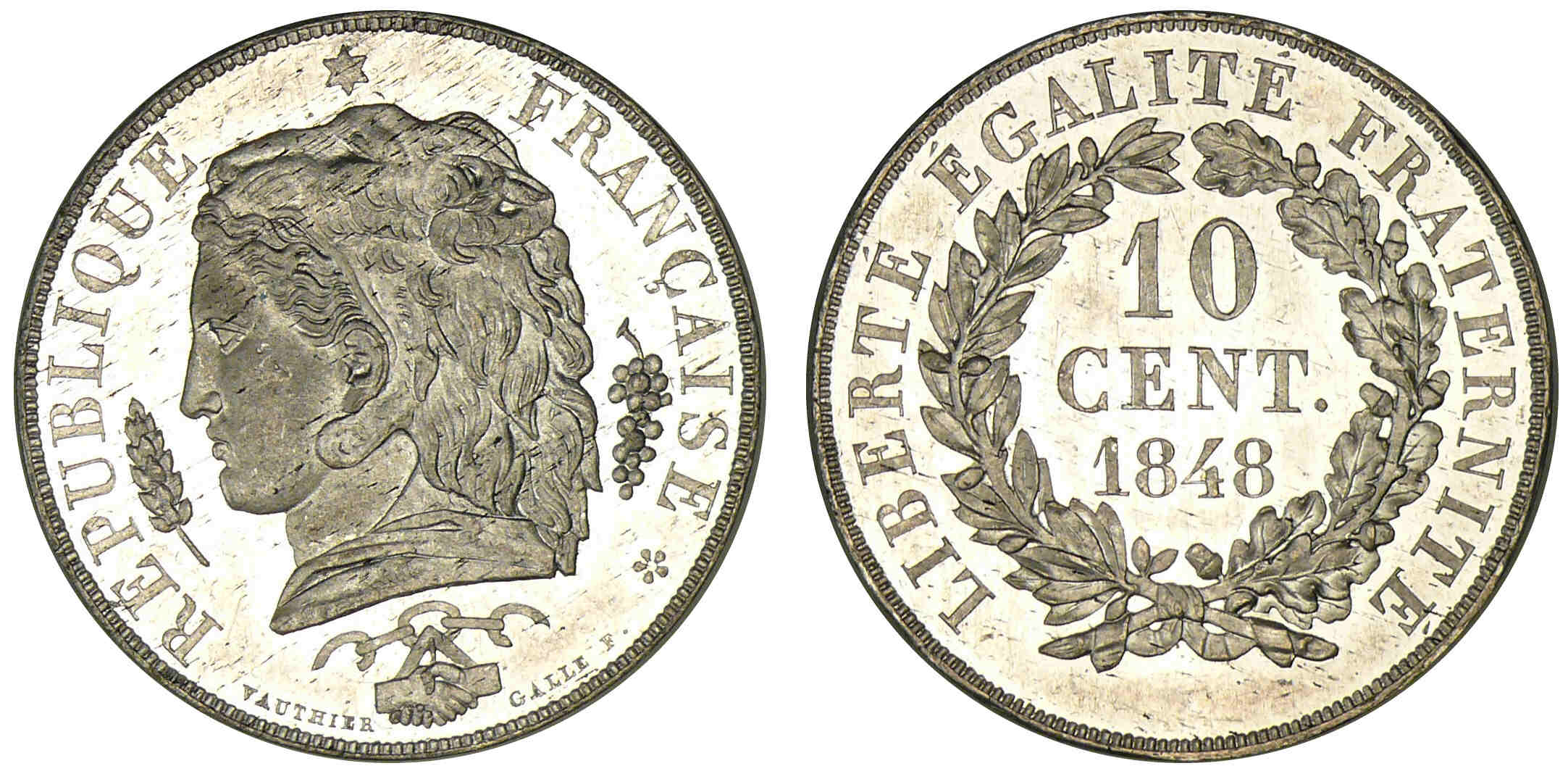 R/ LIBERTE EGALITE FRATERNITE. 10 CENT 1848 dans une couronne de chêne et d’olivier.