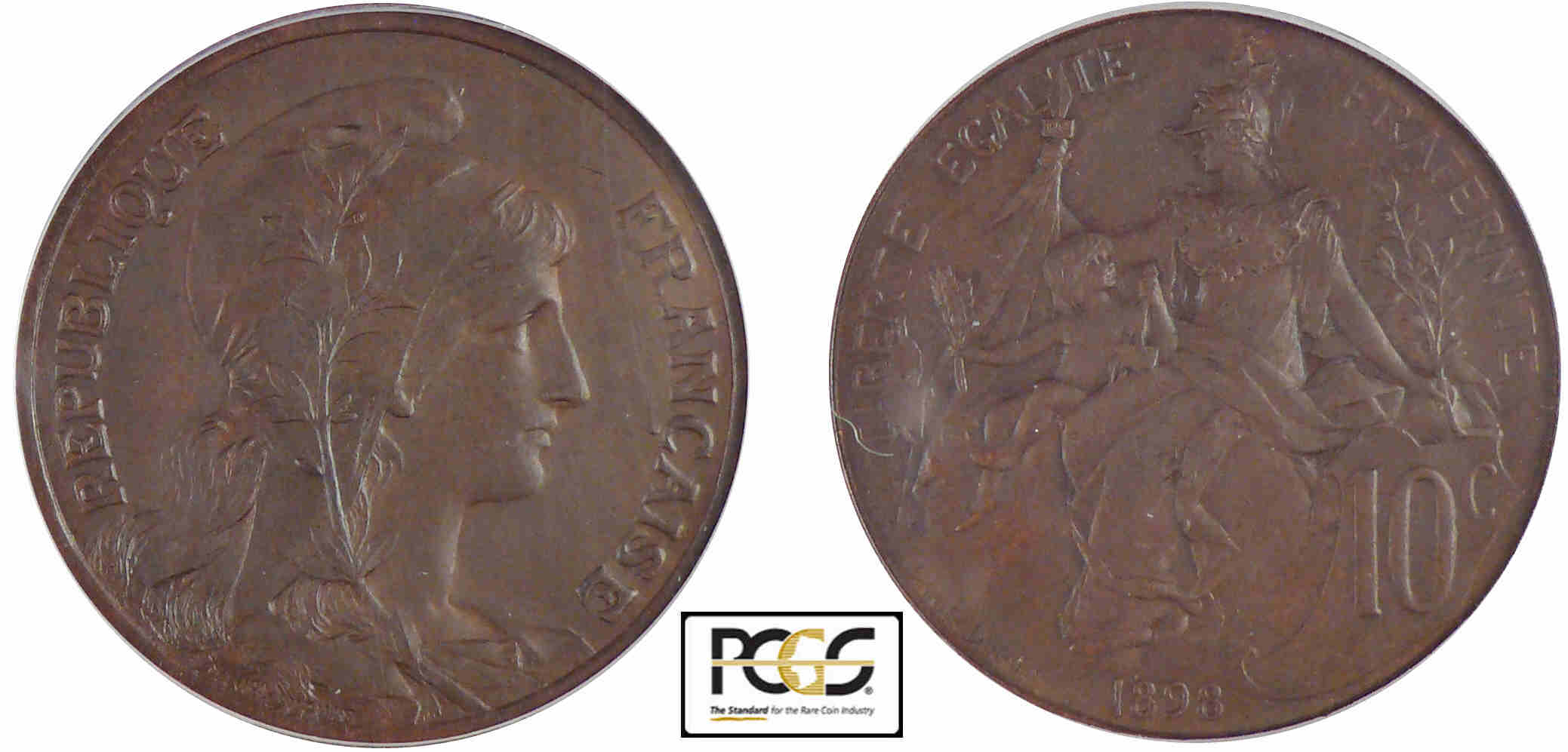 Revers : R/ LIBERTE EGALITE – FRATERNITE // 10 c dans un cartouche. La République cuirassée et drapée, assise à gauche sur un rocher.