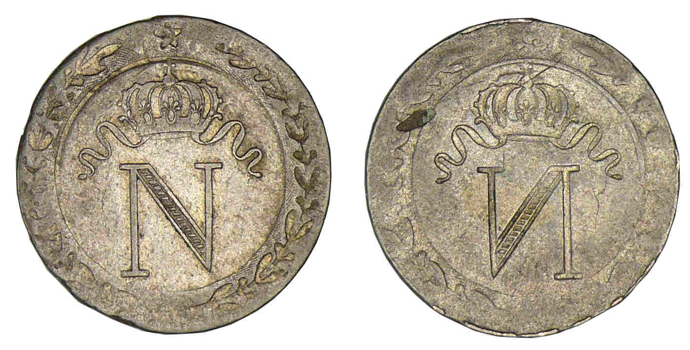 A/ N couronné, grénetis extérieur orné de deux palmes en creux et d’une étoile. Grand N couronné et en relief.