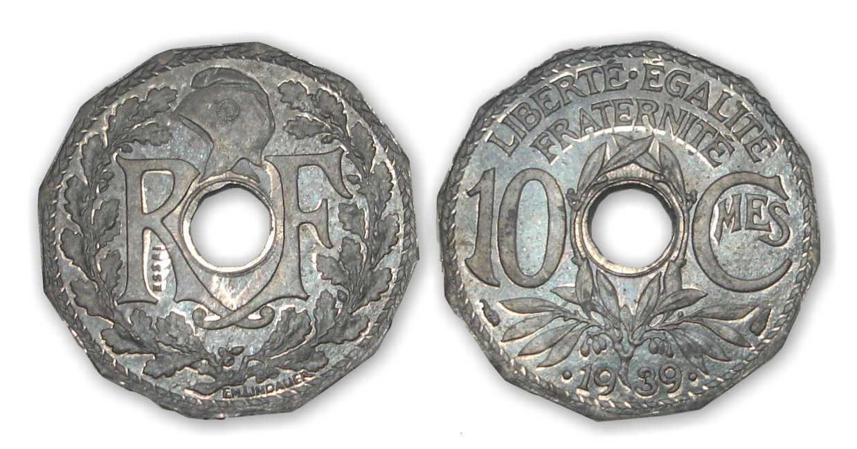 10 ctes Zinc état français .1939. essai flan à 12 pans