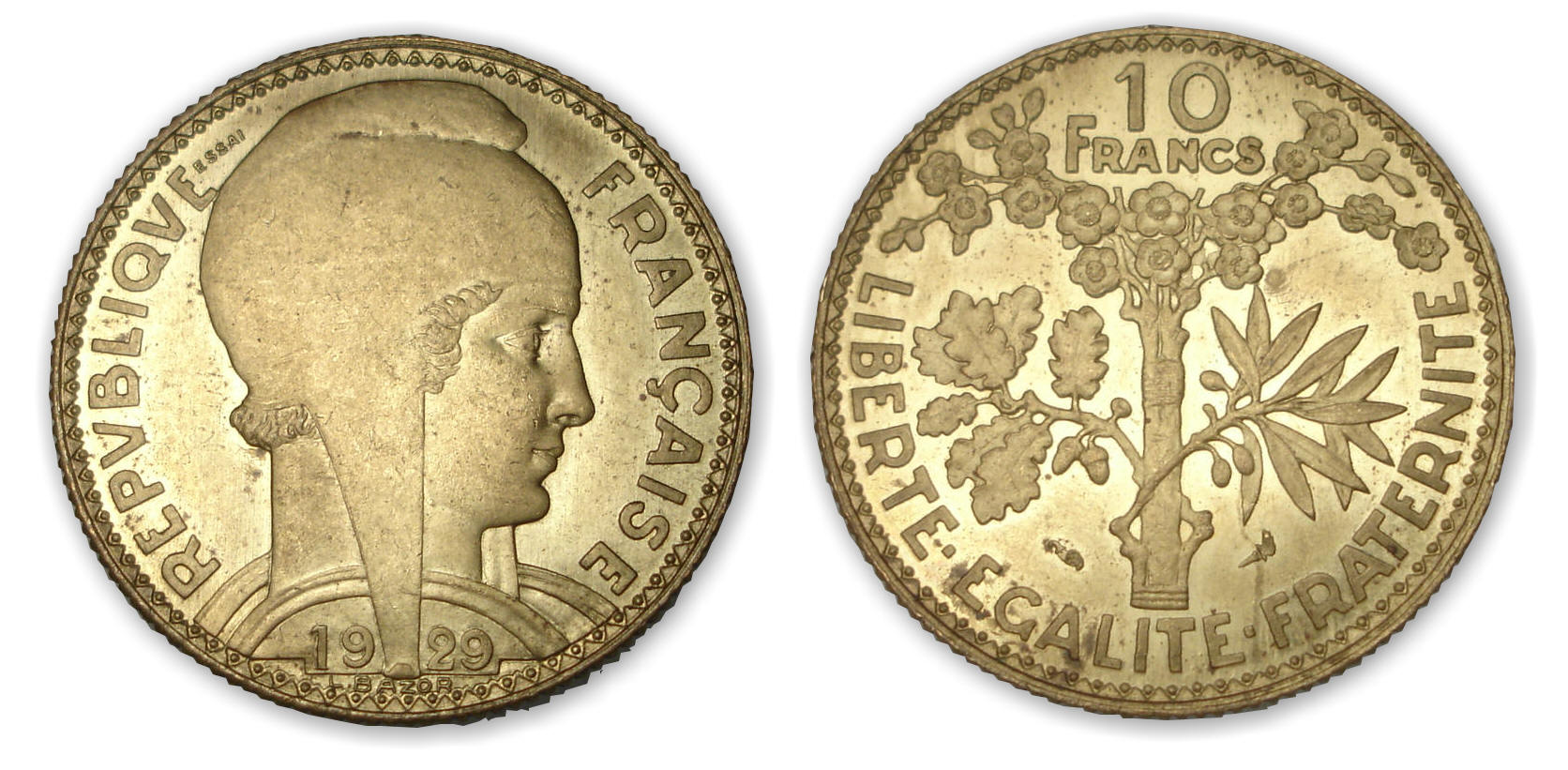 Revers : R/ LIBERTE. EGALITE. FRATERNITE. Greffon d’où sortent trois branches, de chêne, d’olivier et d’églantine, accosté des (différents) et surmonté de 10/ FRANCS.