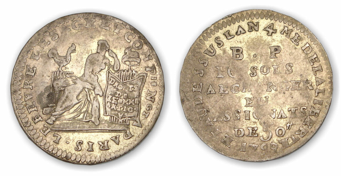 Avers : A/ LEFEVRE LESAGE ET COMPIE NGT A PARIS. La Liberté assise à gauche, appuyée sur un faisceau surmonté d’une pique et d’un bonnet phrygien, devant la Déclaration des Droits de l’Homme et du Citoyen à l’art V, à gauche, coq sur un cippe.