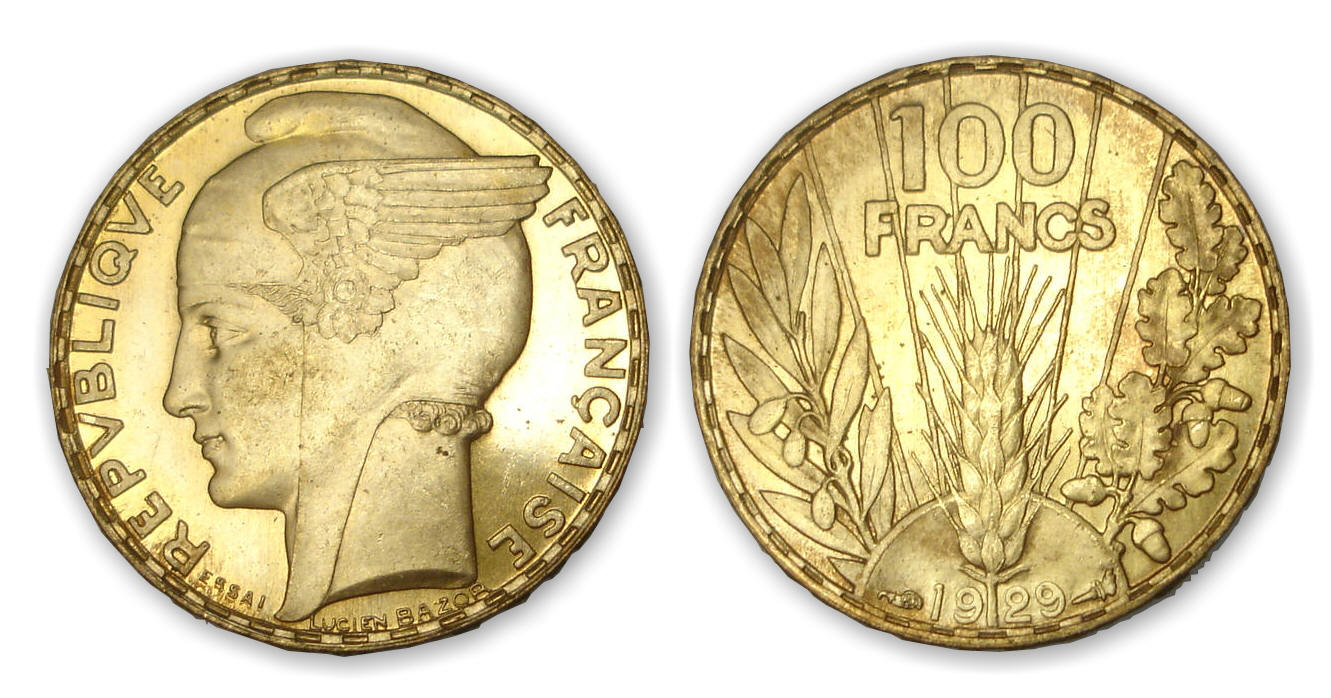 R/ 100 / FRANCS. au-dessus d’un globe d’où sortent un épi, une branche d’olivier et une branche de chêne (millésime) à l’exergue.
