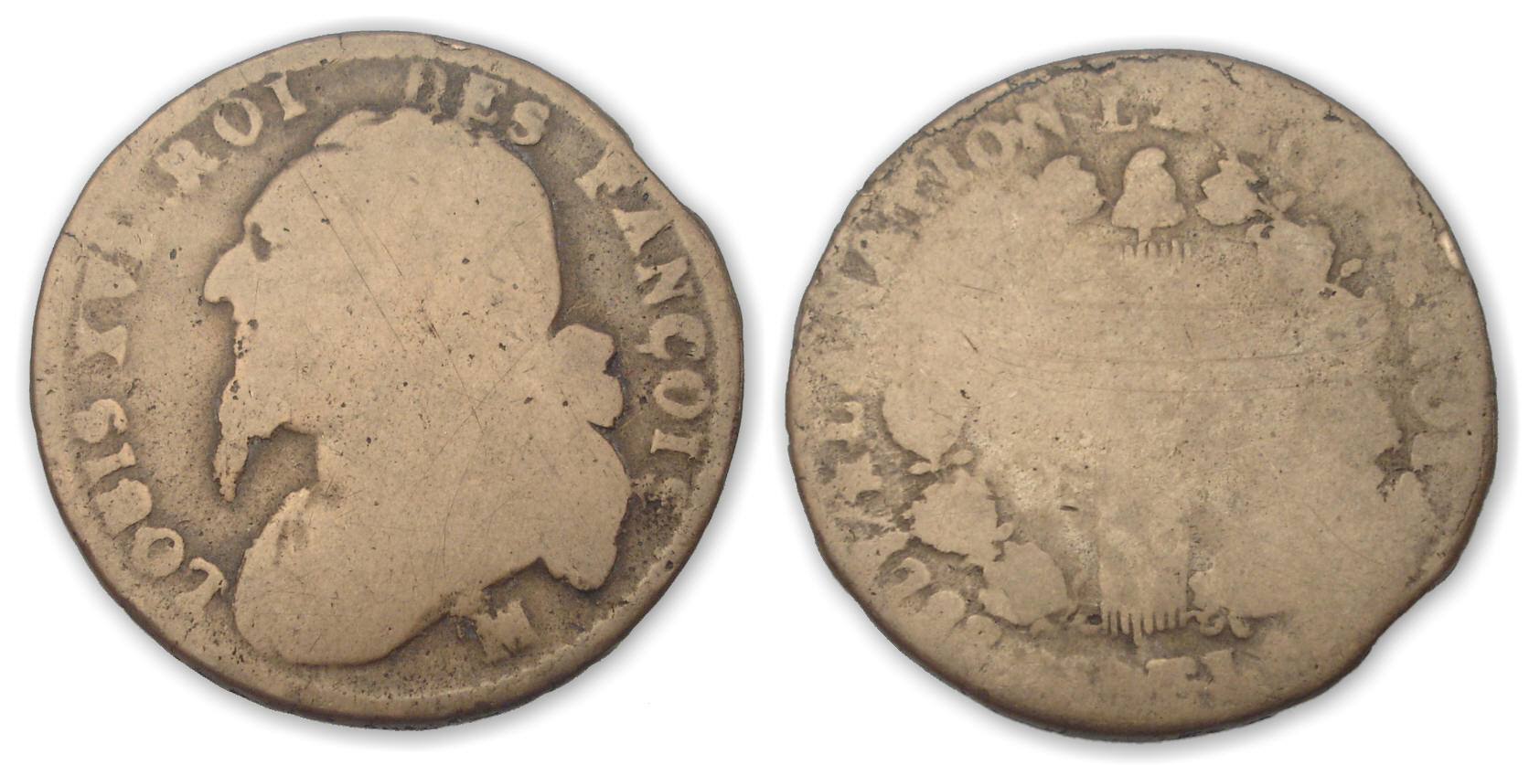 Avers : A/ LOUIS XVI ROI – DES FRANÇOIS / (atelier) Buste de Louis XVI drapé à gauche, tête nue, les cheveux noués dans le cou par un ruban.