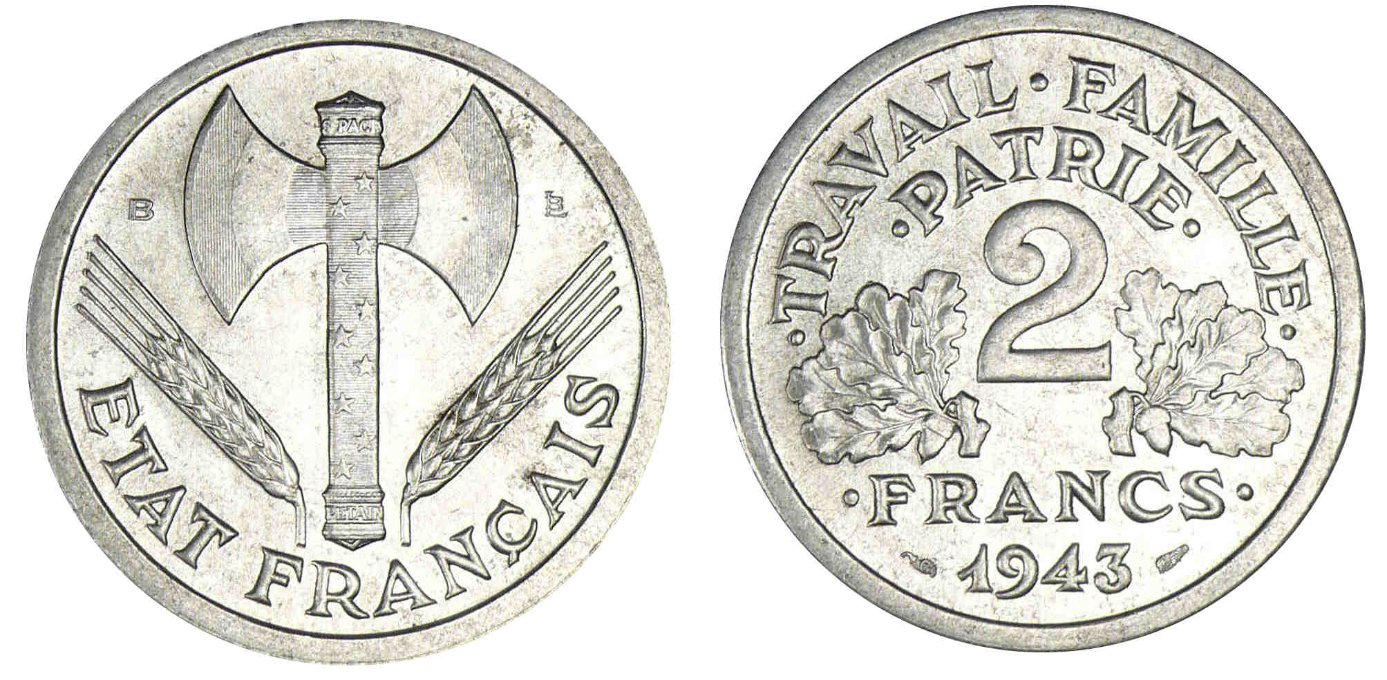 Avers : A/ ETAT FRANÇAIS. Francisque dont le manche est formé par un bâton de maréchal, orné de dix étoiles à cinq rais.