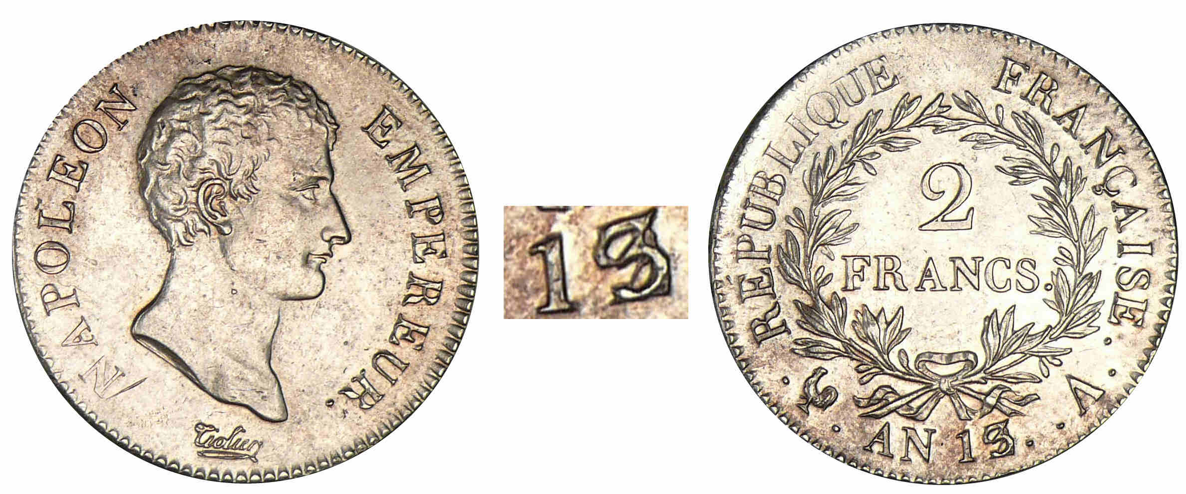 Revers : R/ REPUBLIQUE FRANCAISE./ 2 / FRANCS. / (millésime) (atelier) au centre dans une couronne formée de deux branches d’olivier.