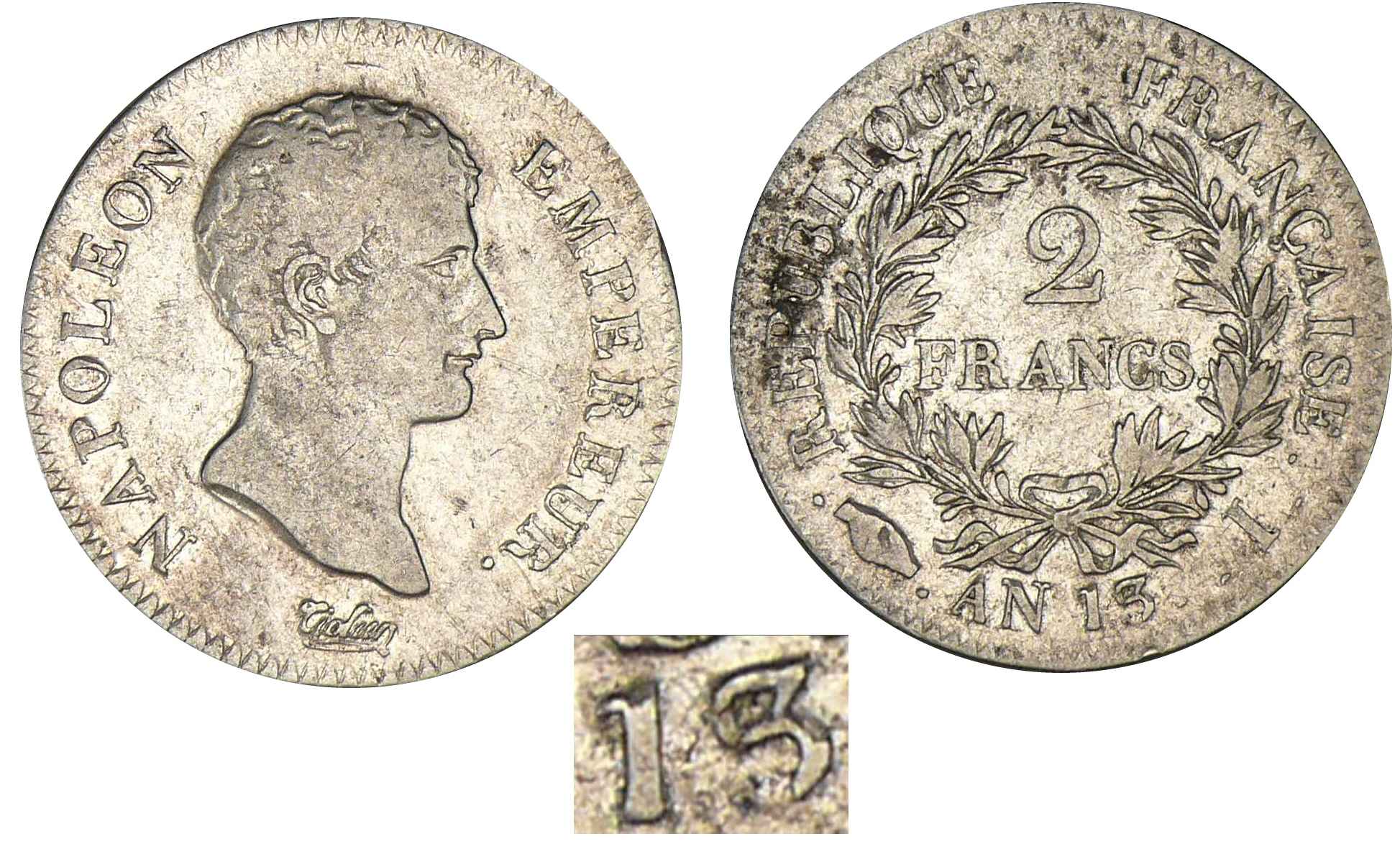 Revers : R/ REPUBLIQUE FRANCAISE./ 2 / FRANCS. / (millésime) (atelier) au centre, dans une couronne formée de deux branches d’olivier.