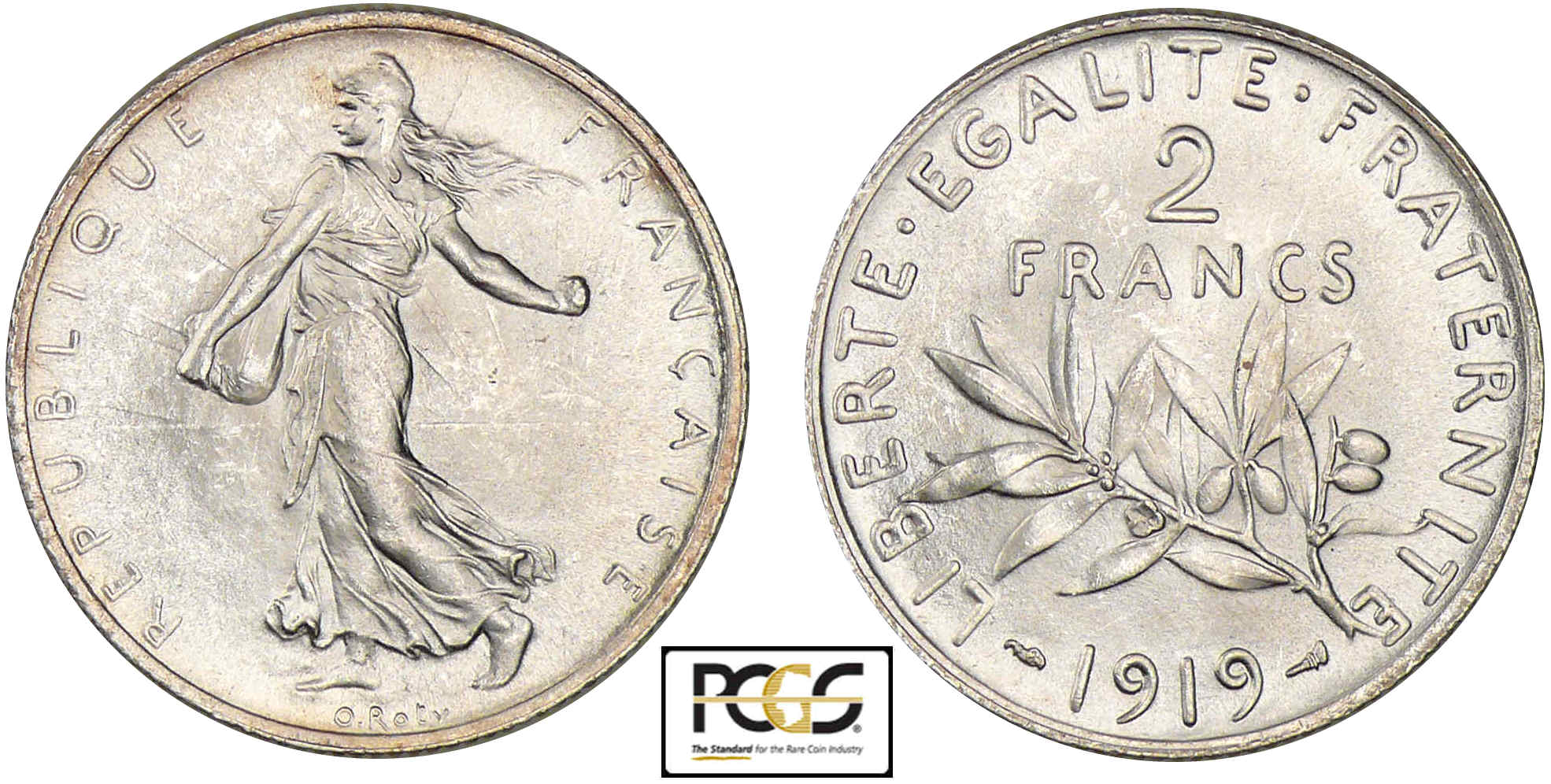 Revers : R/.LIBERTE. EGALITE. FRATERNITE. 2 / FRANCS au-dessus d’une branche d’olivier. Millésime à l’exergue.