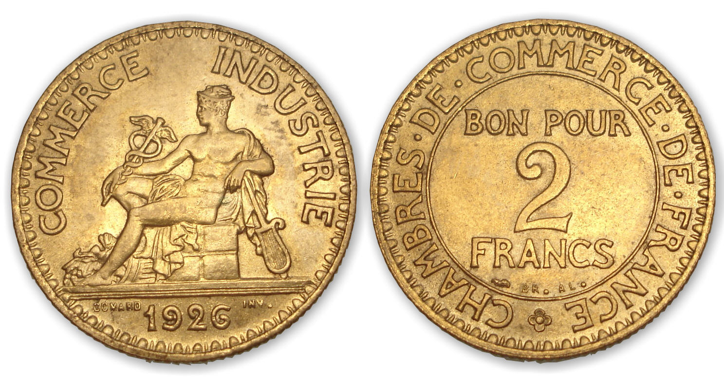 Revers : R/ (rosette) CHAMBRES. DE. COMMERCE. DE. FRANCE. BON POUR / 2 / FRANCS en trois lignes dans le champ, au-dessous Br. Al.