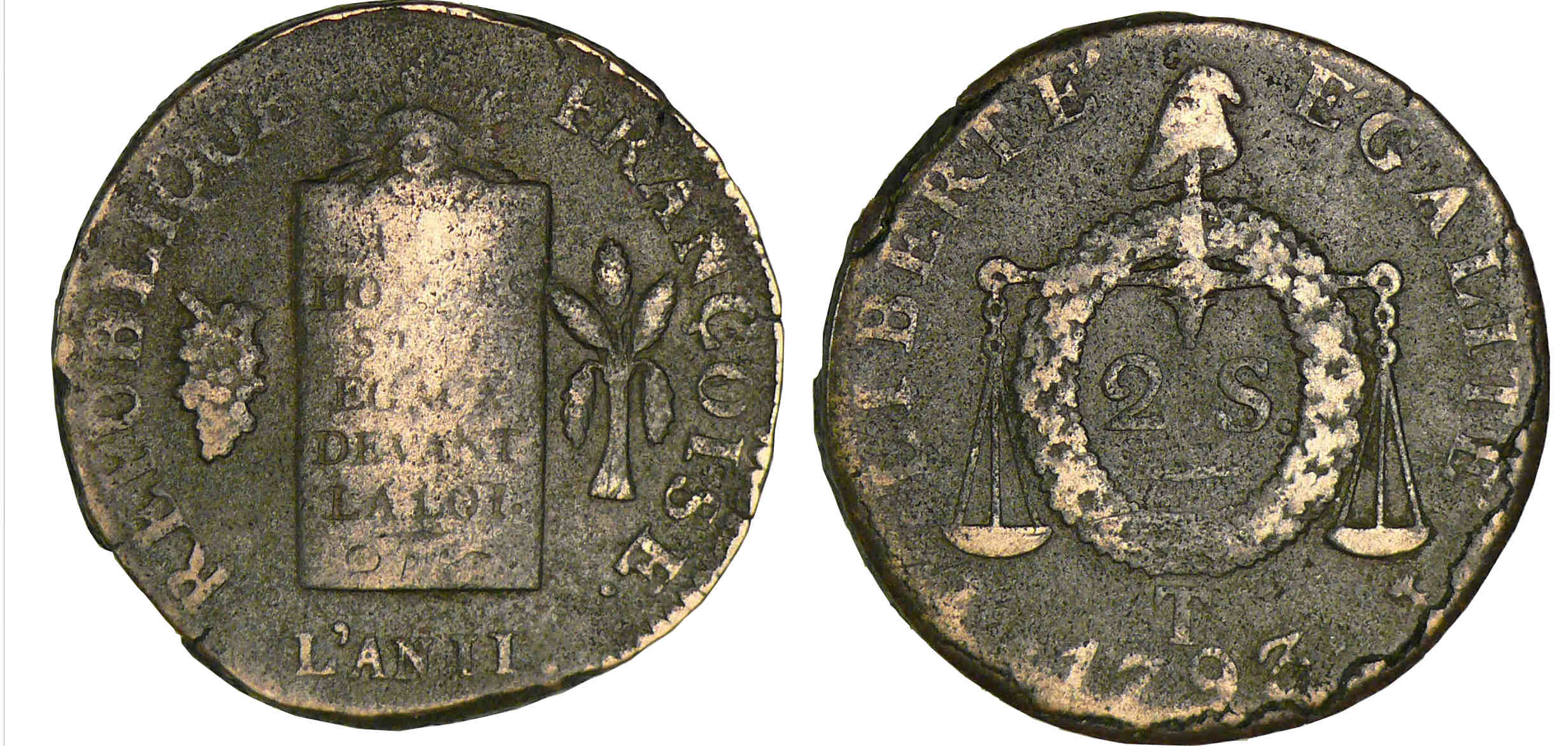 R/ Balance sommée d’un bonnet phrygien à laquelle est appendue une couronne de chêne.
