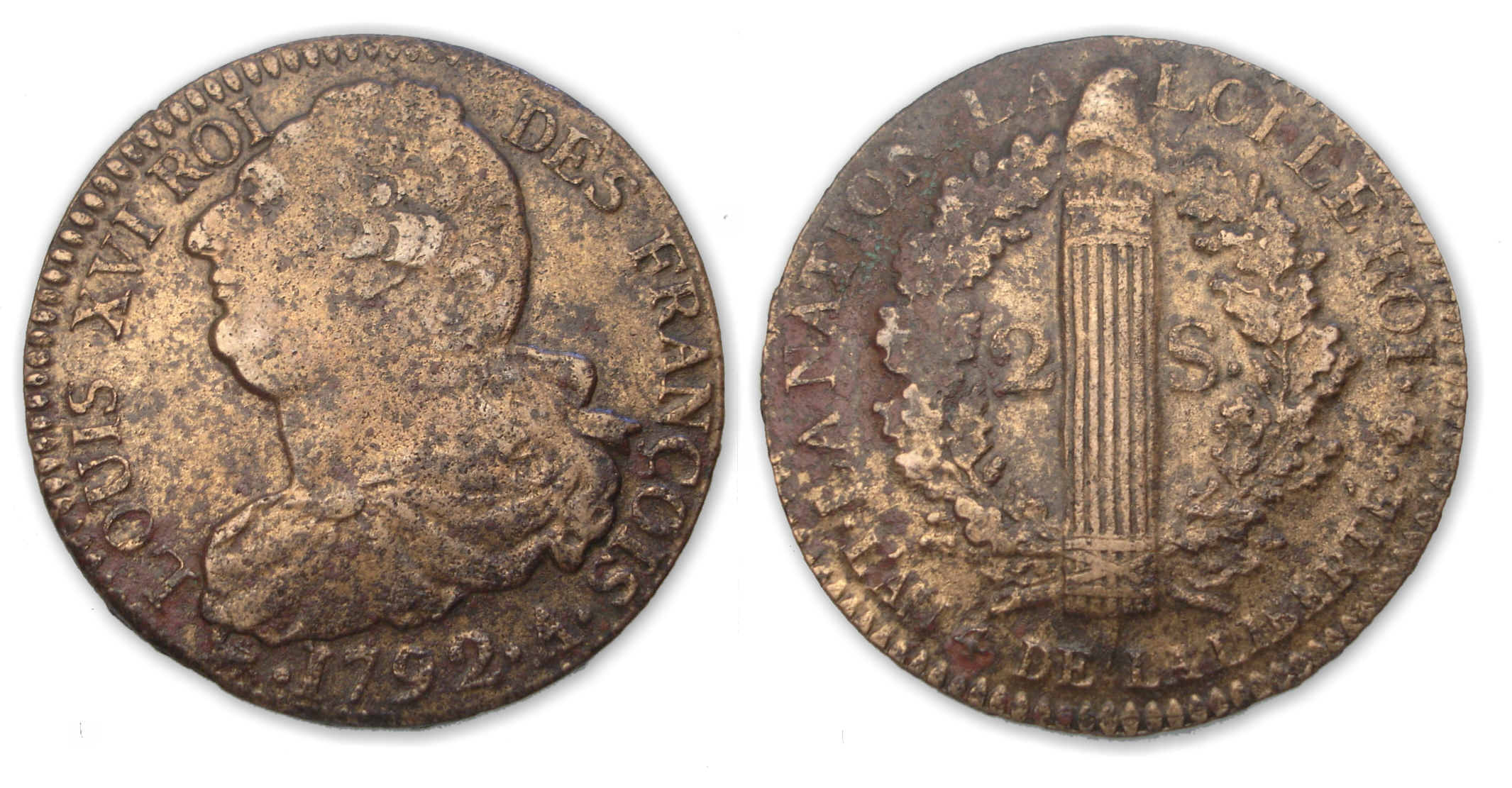 Revers : R/ LA NATION LA – LOI LE ROI / L’AN 4 DE LA LIBERTE / 2-S•. Faisceau orné d’une pique surmontée d’un bonnet phrygien dans une couronne de chêne.