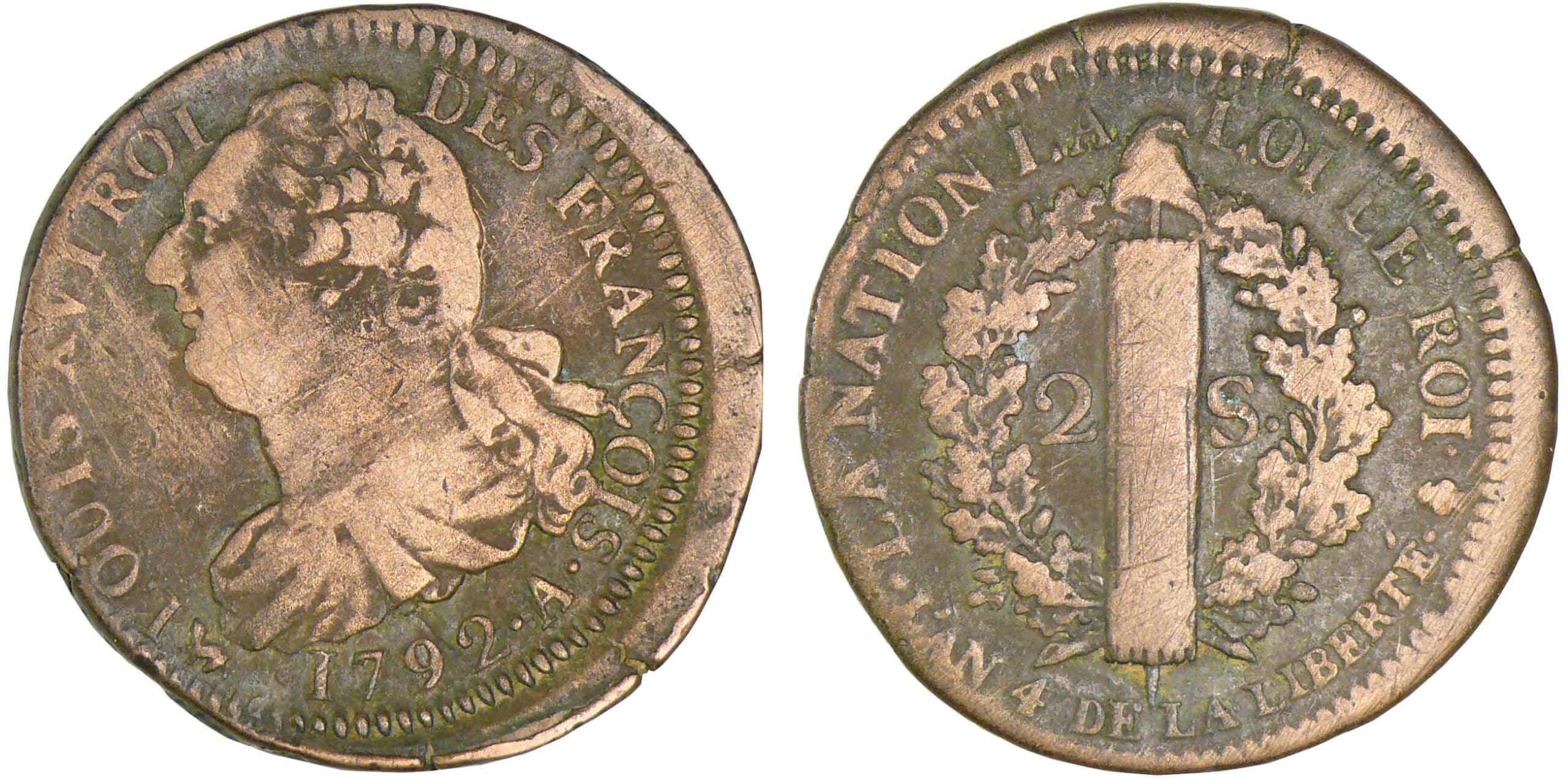 Revers : R/ LA NATION LA – LOI LE ROI / L’AN 4 DE LA LIBERTE / 2-S°. Faisceau orné d’une pique surmontée d’un bonnet phrygien dans une couronne de chêne.