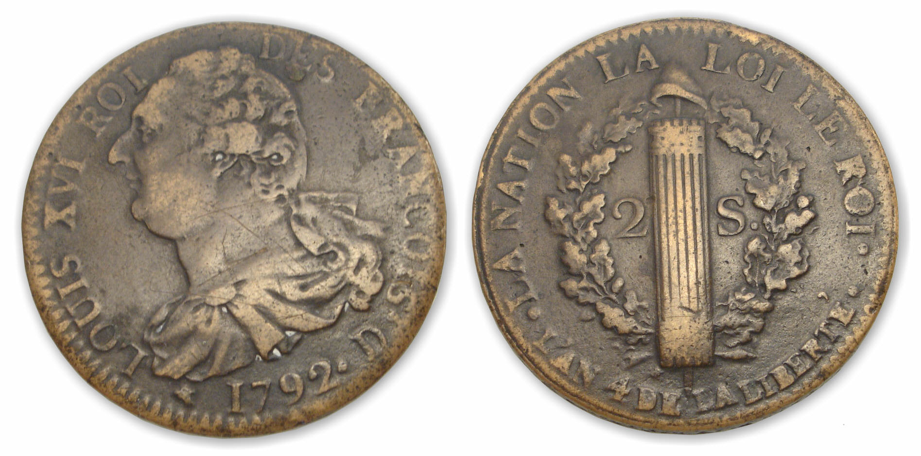 Revers : R/ LA NATION LA – LOI LE ROI / L’AN 4 DE LA LIBERTE / 2-S•. Faisceau orné d’une pique surmontée d’un bonnet phrygien dans une couronne de chêne.