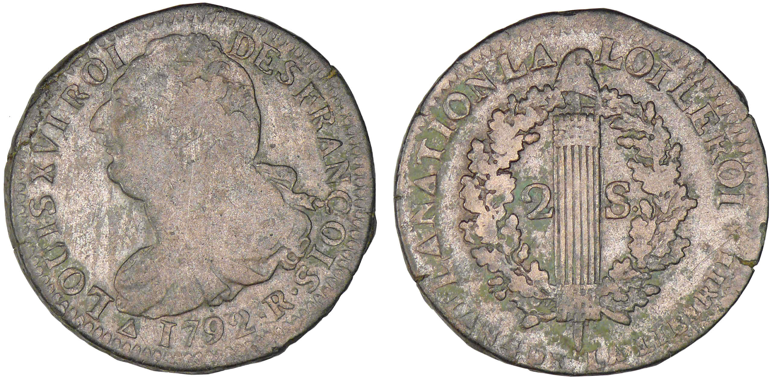 Revers : R/ LA NATION LA – LOI LE ROI / L’AN 4 DE LA LIBERTE / 2-S°. Faisceau orné d’une pique surmontée d’un bonnet phrygien dans une couronne de chêne.