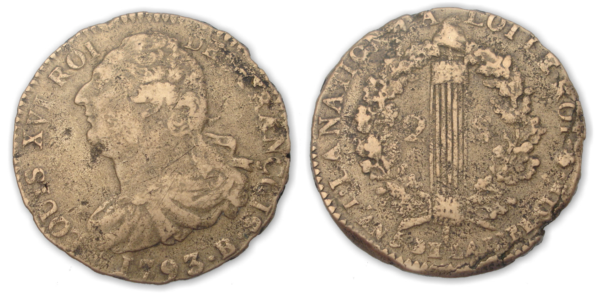 Revers : R/ LA NATION LA – LOI LE ROI / L’AN 5 DE LA LIBERTE / 2-S•. Faisceau orné d’une pique surmontée d’un bonnet phrygien dans une couronne de chêne.