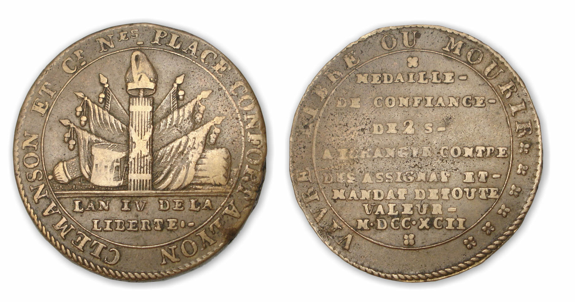 Revers : R/ VIVRE LIBRE OU MOURIR******. au centre en dix lignes : * / MEDAILLE- / DE CONFIANCE- / DE 2 S- / A ECHANGER CONTRE / DES ASSIGNAT ET- / MANDAT DE TOUTE / VALEUR- / M.DCC.XCII / *.