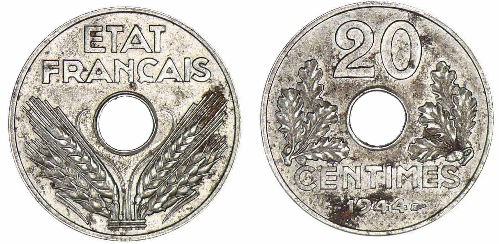 R/ 20 / CENTIMES / 1944 entre deux branches de chêne portant chacune un gland et trois feuilles.
