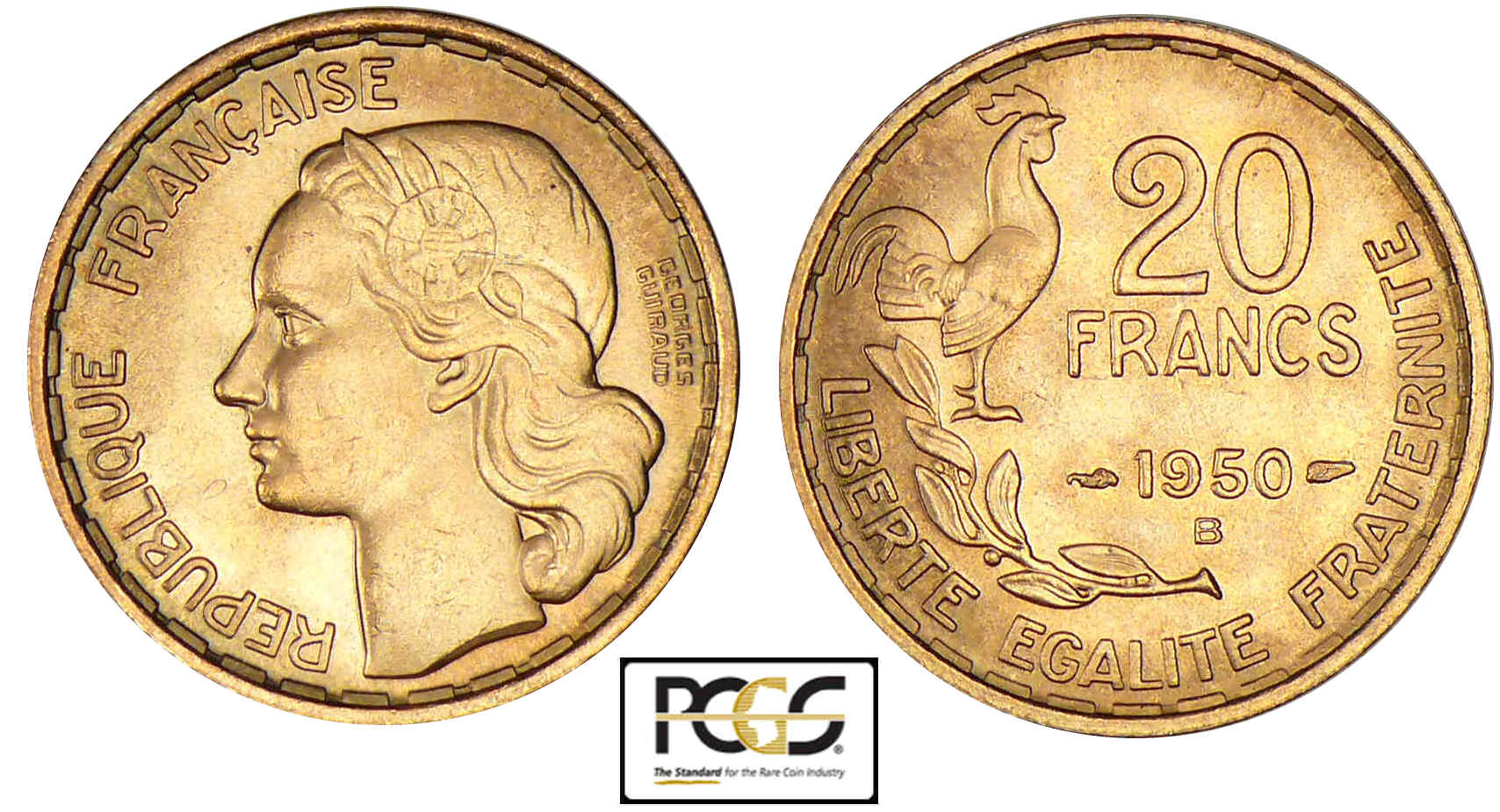 R/ LIBERTE – EGALITE – FRATERNITE. 20 / FRANCS . Coq debout à droite au-dessus d’une branche d’olivier.