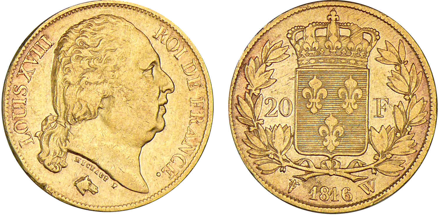 20 francs Louis XVIII au buste nu 1816 W (Lille)
