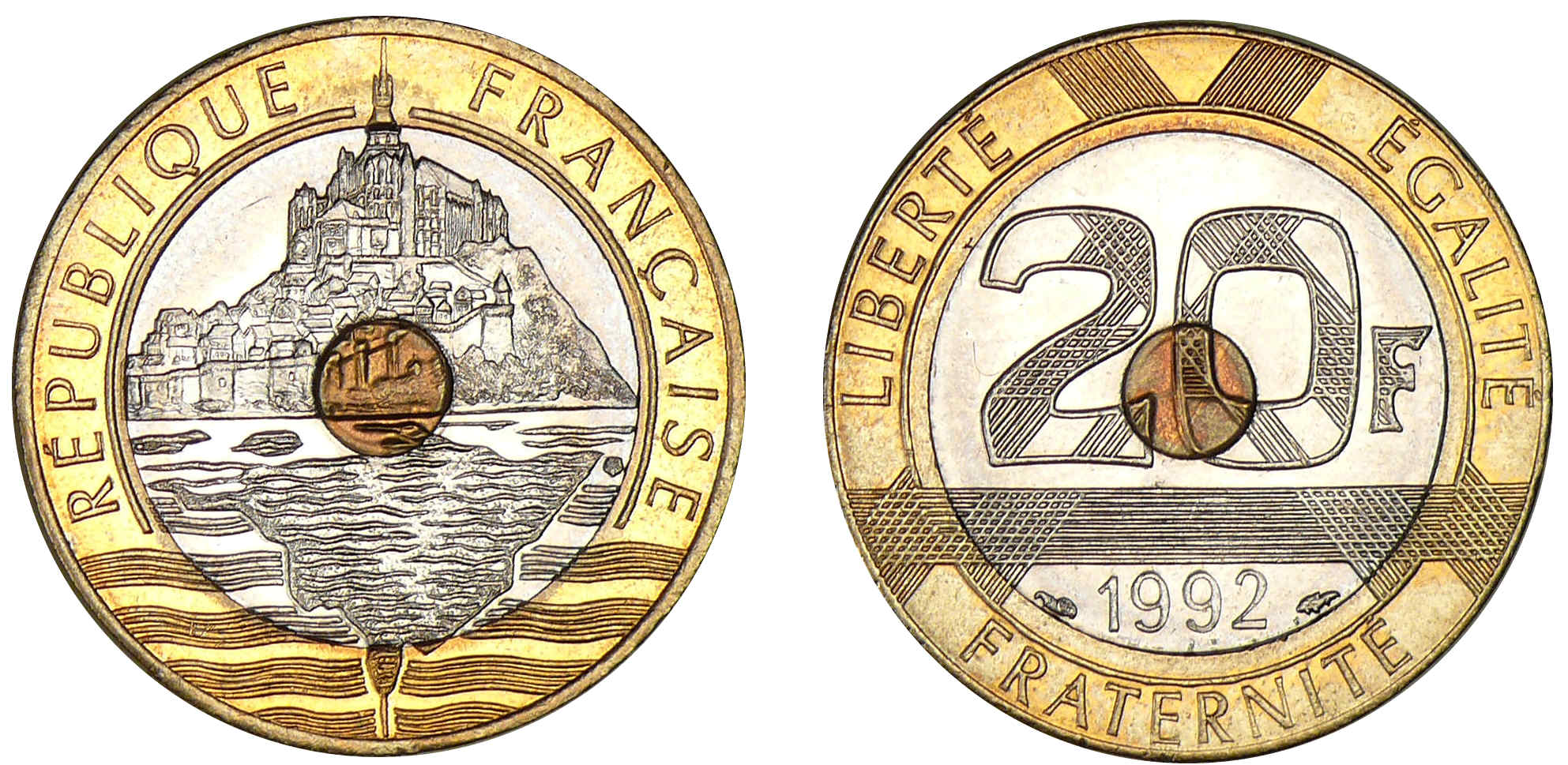 20 francs Mont Saint-Michel 1992 – V ouvert, 4 cannelures