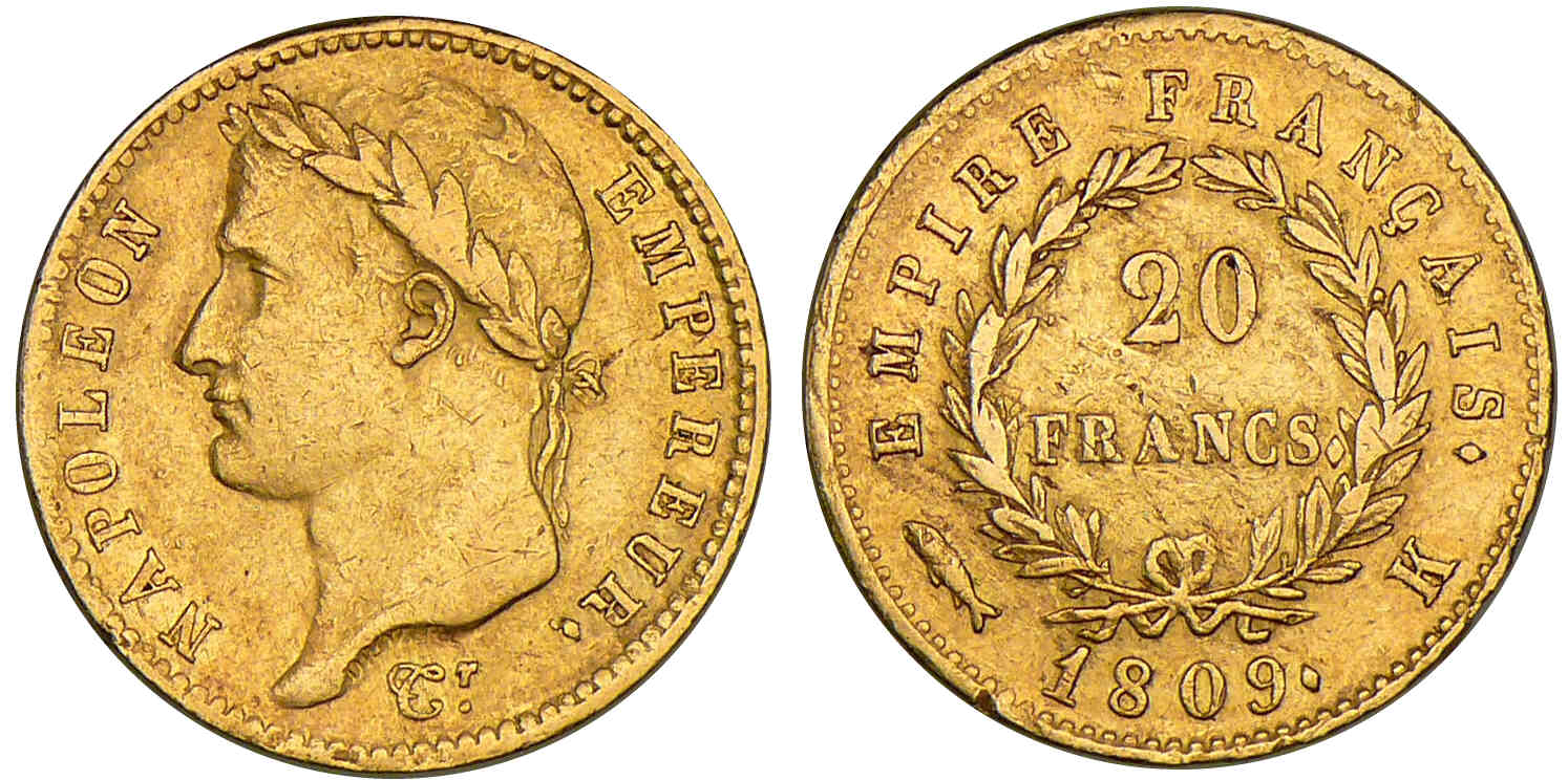 20 francs Napoléon revers empire 1809 K (Bordeaux)
