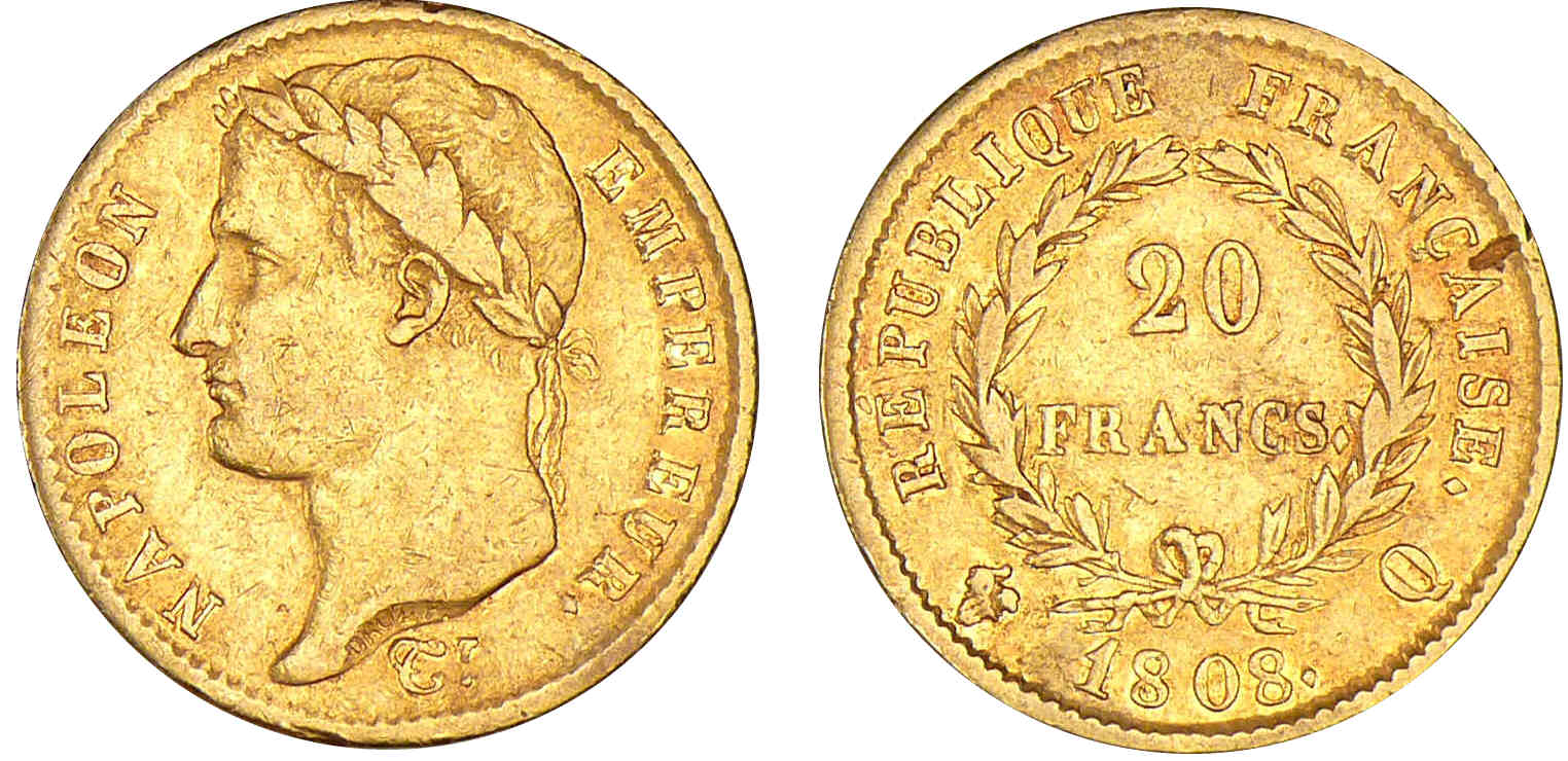 20 francs Napoléon revers république 1808 Q (Perpignan)