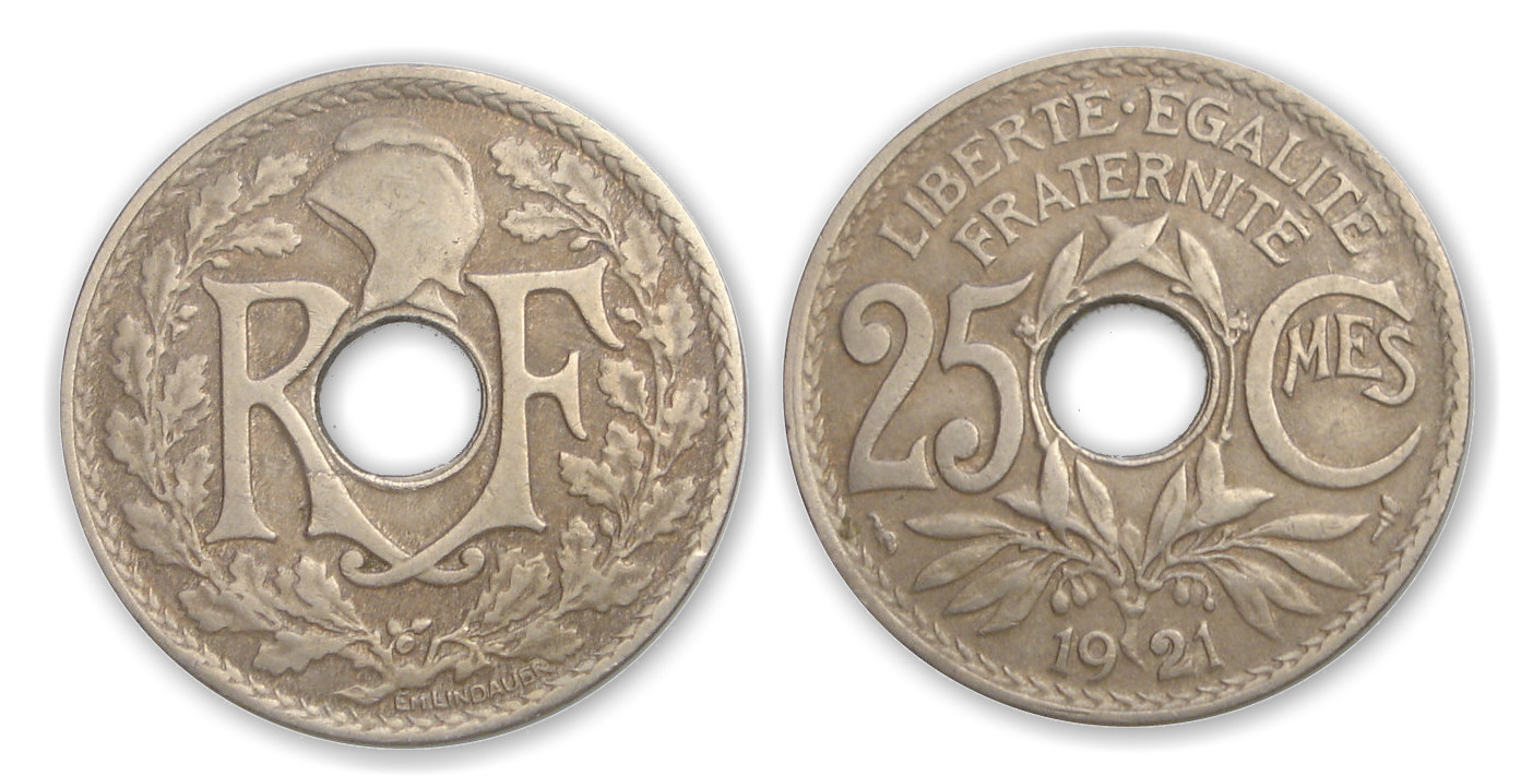Revers : R/ LIBERTÉ. ÉGALITÉ / FRATERNITÉ / 25 – CMES souligné / (millésime) Branche d’olivier entourant un rond perforé.
