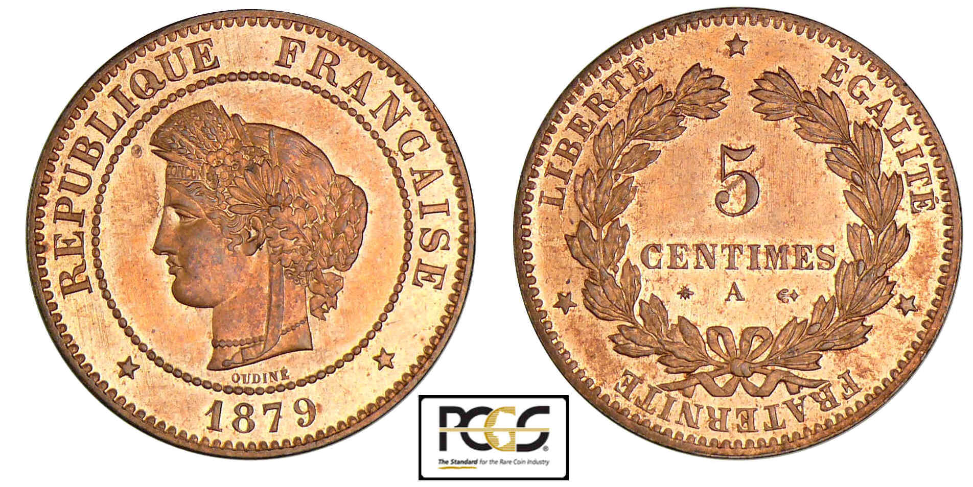 Revers : R/ * LIBERTE * EGALITE * FRATERNITE. 5 / CENTIMES / A (ancre) dans une couronne formée d’une branche de laurier et d’une branche d’olivier.