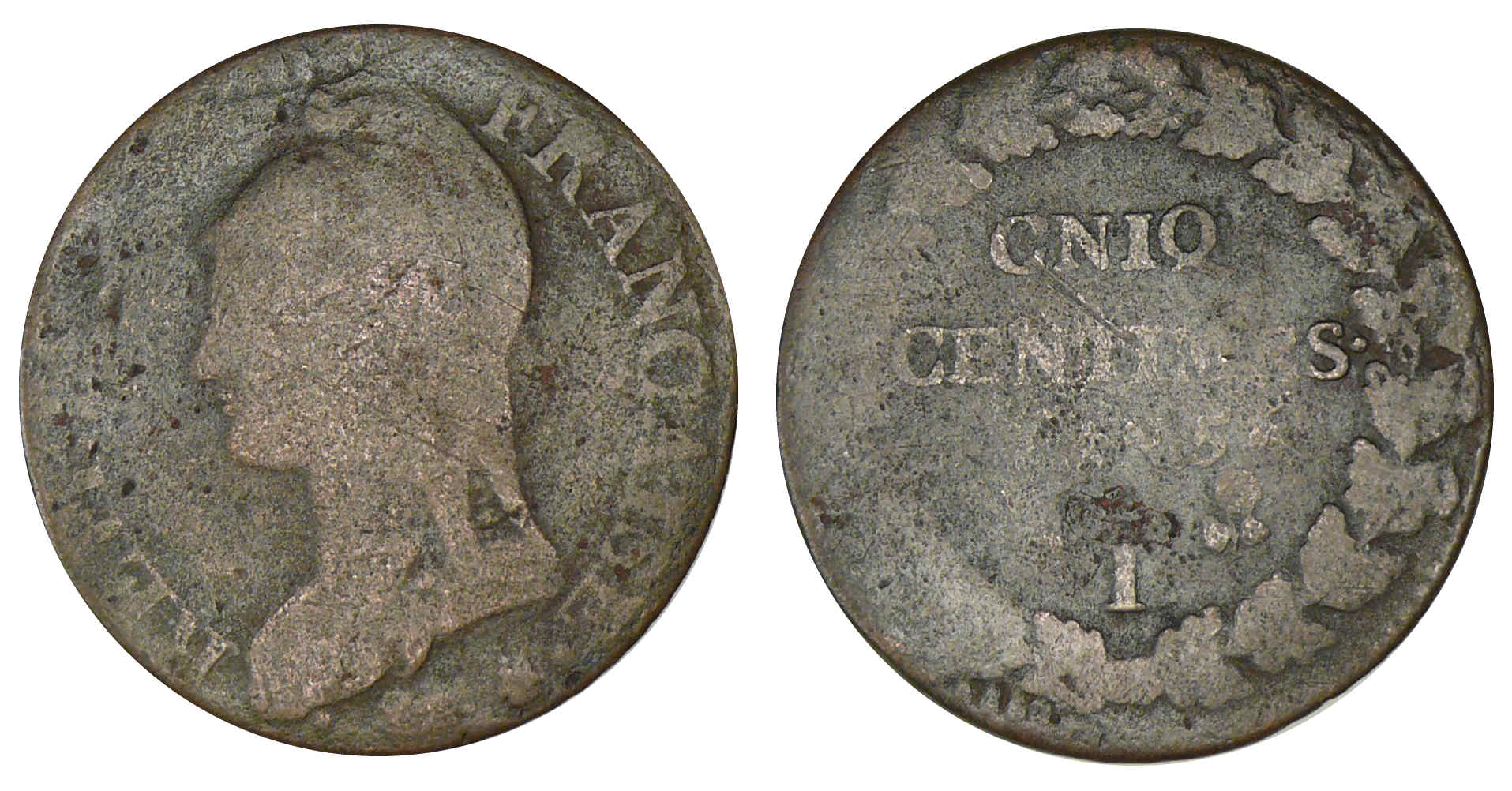Observation : Rare variété CNIQ au lieu de CINQ. Cette monnaie a aussi les traces d’une petite casquette à 12 heures.