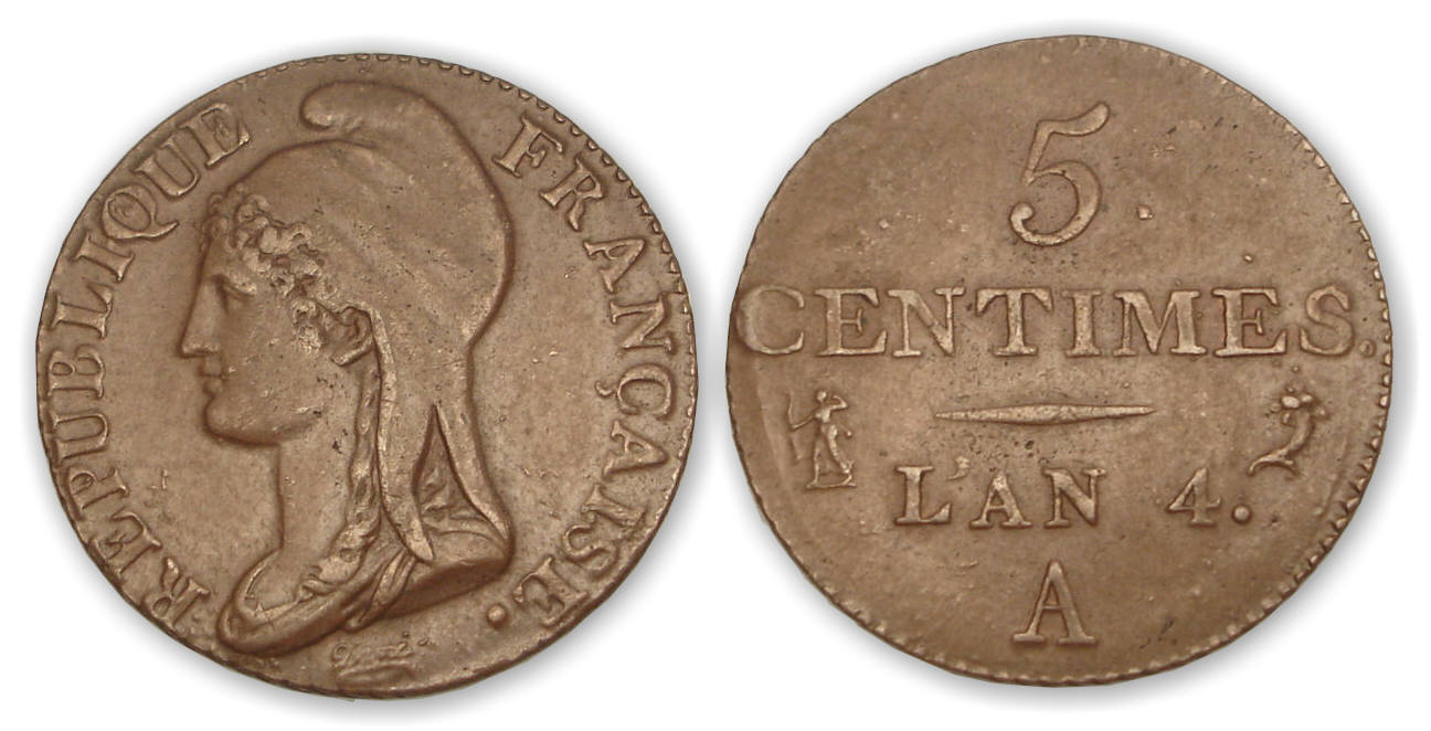 Revers : R/ 5 / CENTIMES. / L’AN 4. / A. en quatre lignes.
