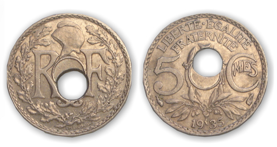 Revers : R/ LIBERTÉ. ÉGALITÉ / FRATERNITÉ / 5 – CMES / (millésime) Branche d’olivier entourant un rond perforé.