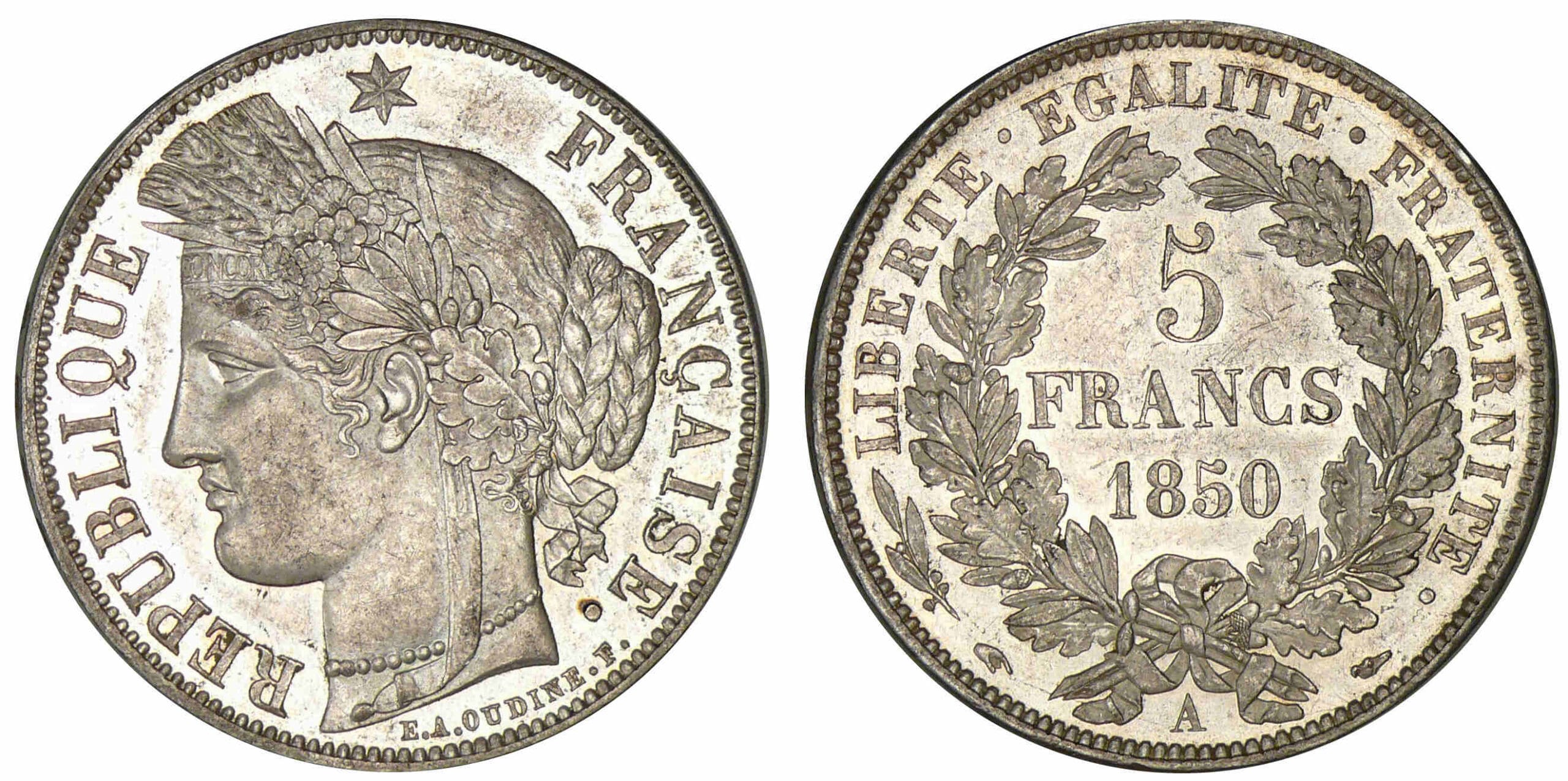 Revers : R/ (branche d’olivier) LIBERTE. EGALITE. FRATERNITE. / (atelier) / 5 / FRANCS / (millésime) dans une couronne.