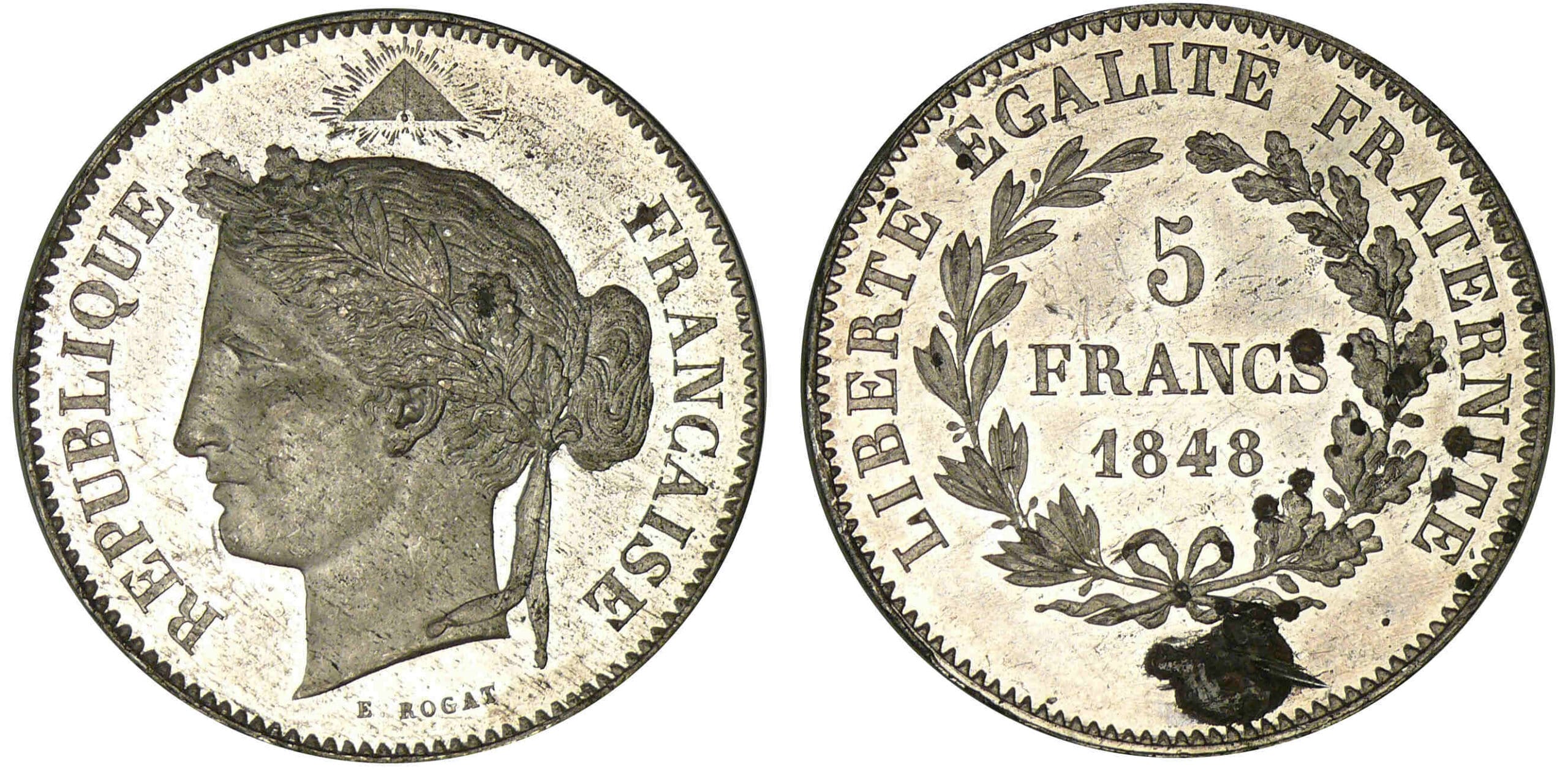 R/ LIBERTE EGALITE FRATERNITE. 5 FRANCS 1848 dans une couronne de chêne et d’olivier.
