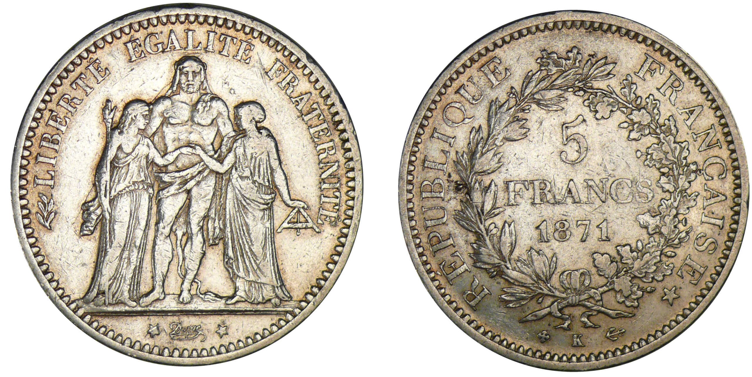 Revers : R/ REPUBLIQUE – FRANÇAISE // 5 / FRANCSdans une couronne formée d’une branche d’olivier et d’une branche de chêne.