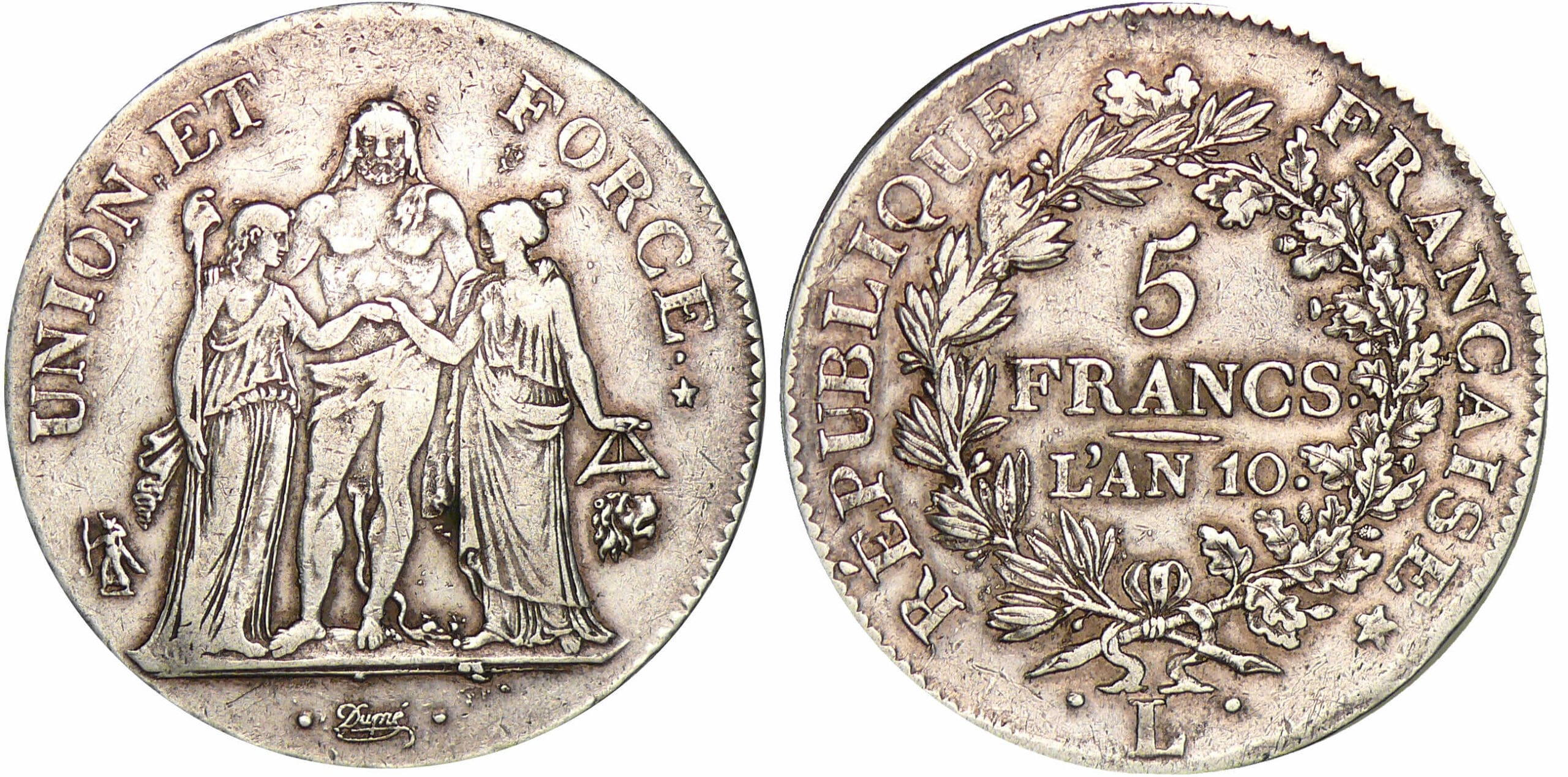 / 5 francs Hercule union et force – An 10 L (Bayonne)