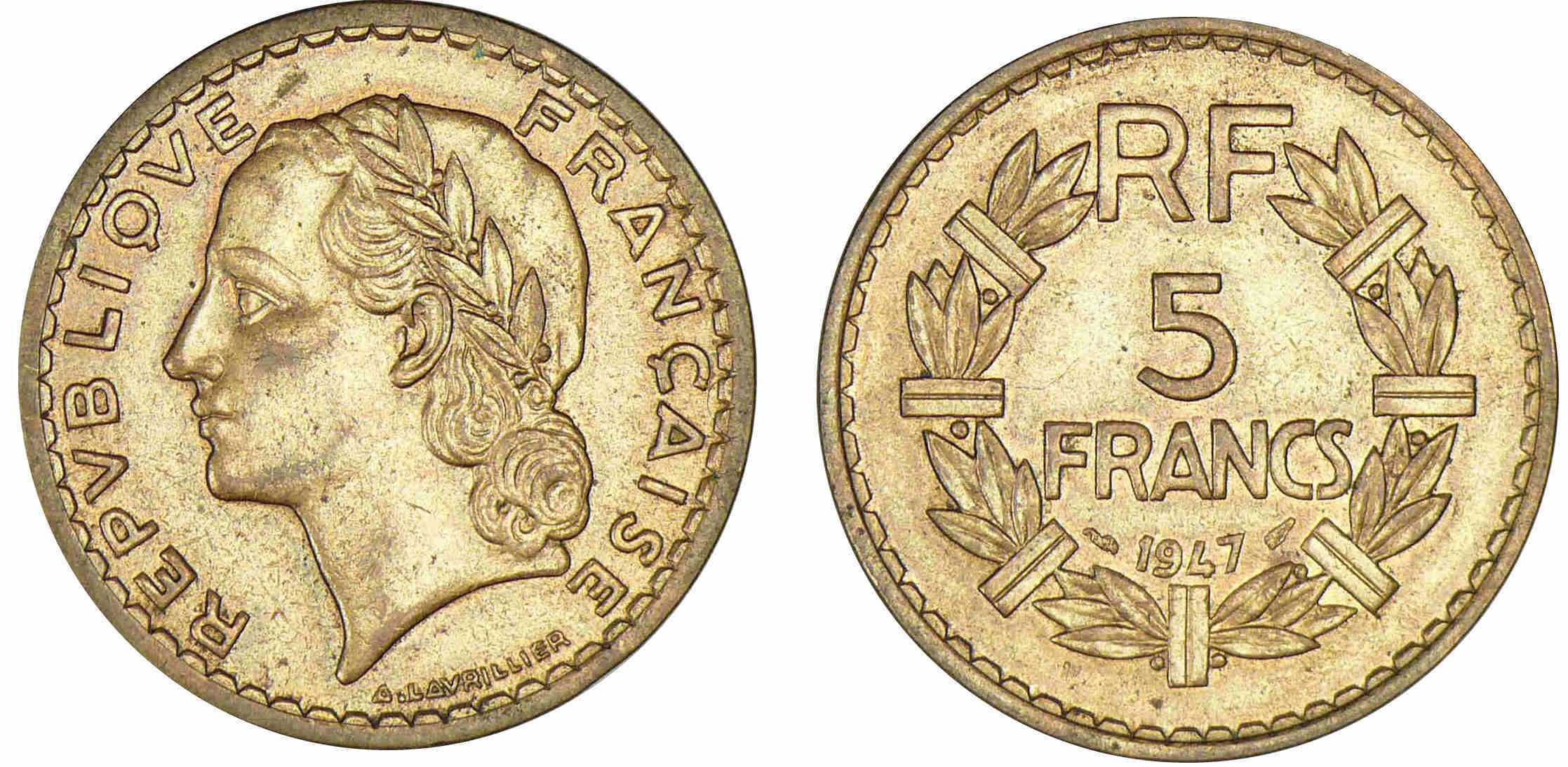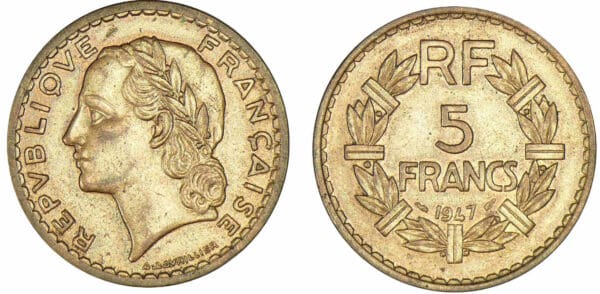 Revers : R/ RF / 5 / FRANCS / (millésime) dans une couronne de laurier ornée de sept bagues.