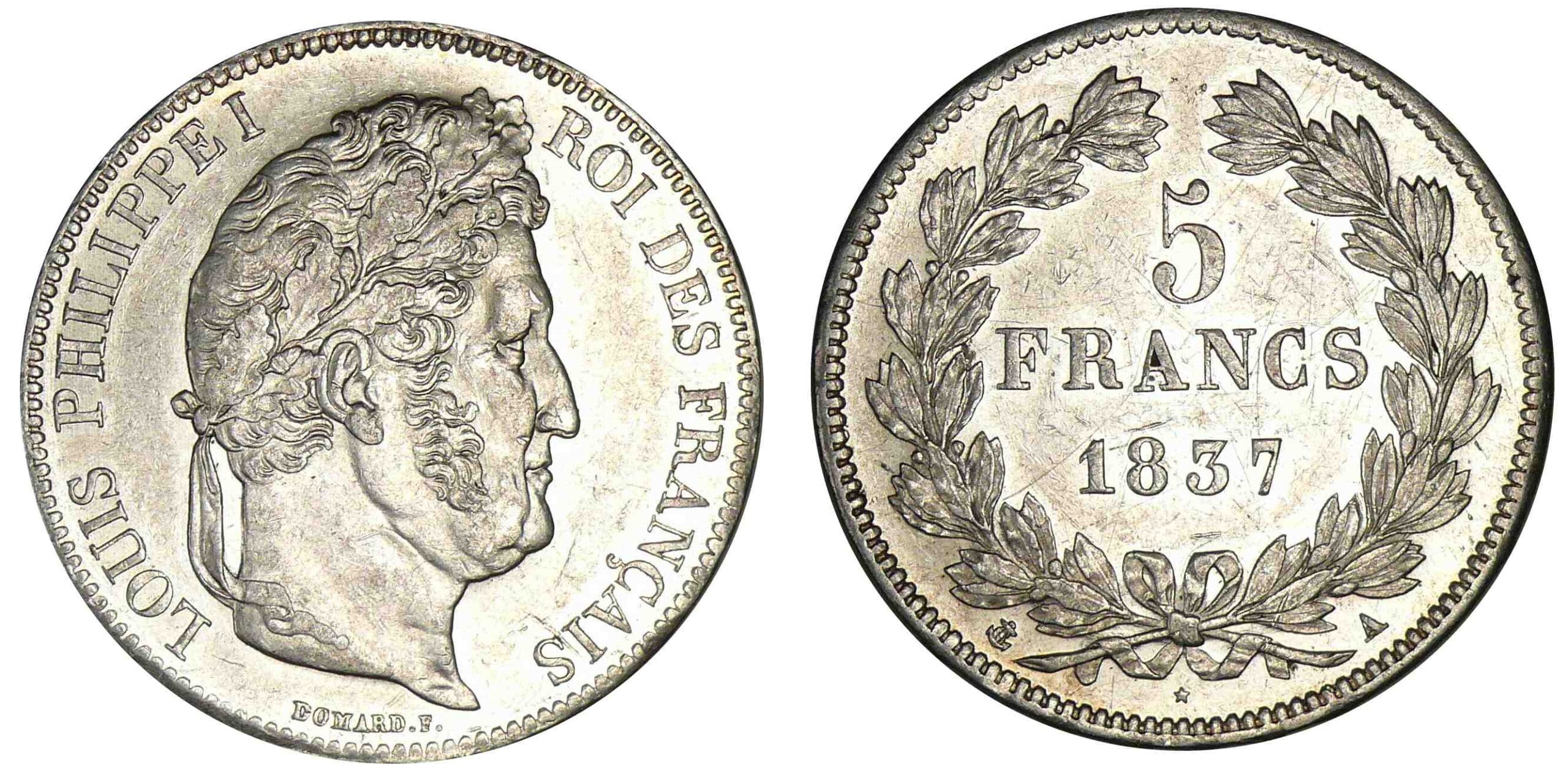 5 francs Louis-Philippe I – tête laurée – 2ème type – 1837 A (Paris)