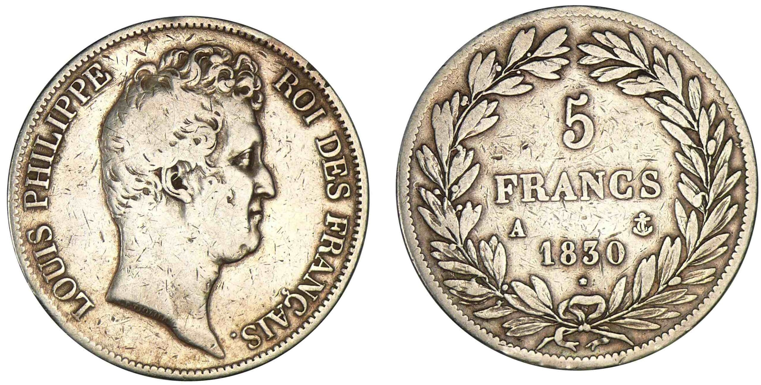 / 5 francs Louis-Philippe – tête nue – tranche relief – 1830 A (Paris)