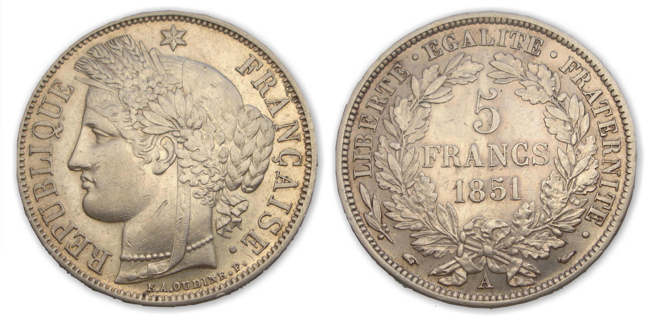 Avers : A/ REPUBLIQUE – FRANÇAISE. Tête de Cérès à gauche, surmontée d’une étoile, coiffée d’une couronne d’épis, de feuilles de chêne et d’olivier, avec un bandeau inscrit CONCOR, signé E.A. OUDINÉ. F. au-dessous du buste.