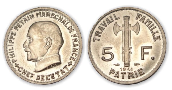 R/ TRAVAIL – FAMILLE / PATRIE // 5 – F. / 1941. S. PACIS en haut de la francisque, P. PETAIN à sa base.